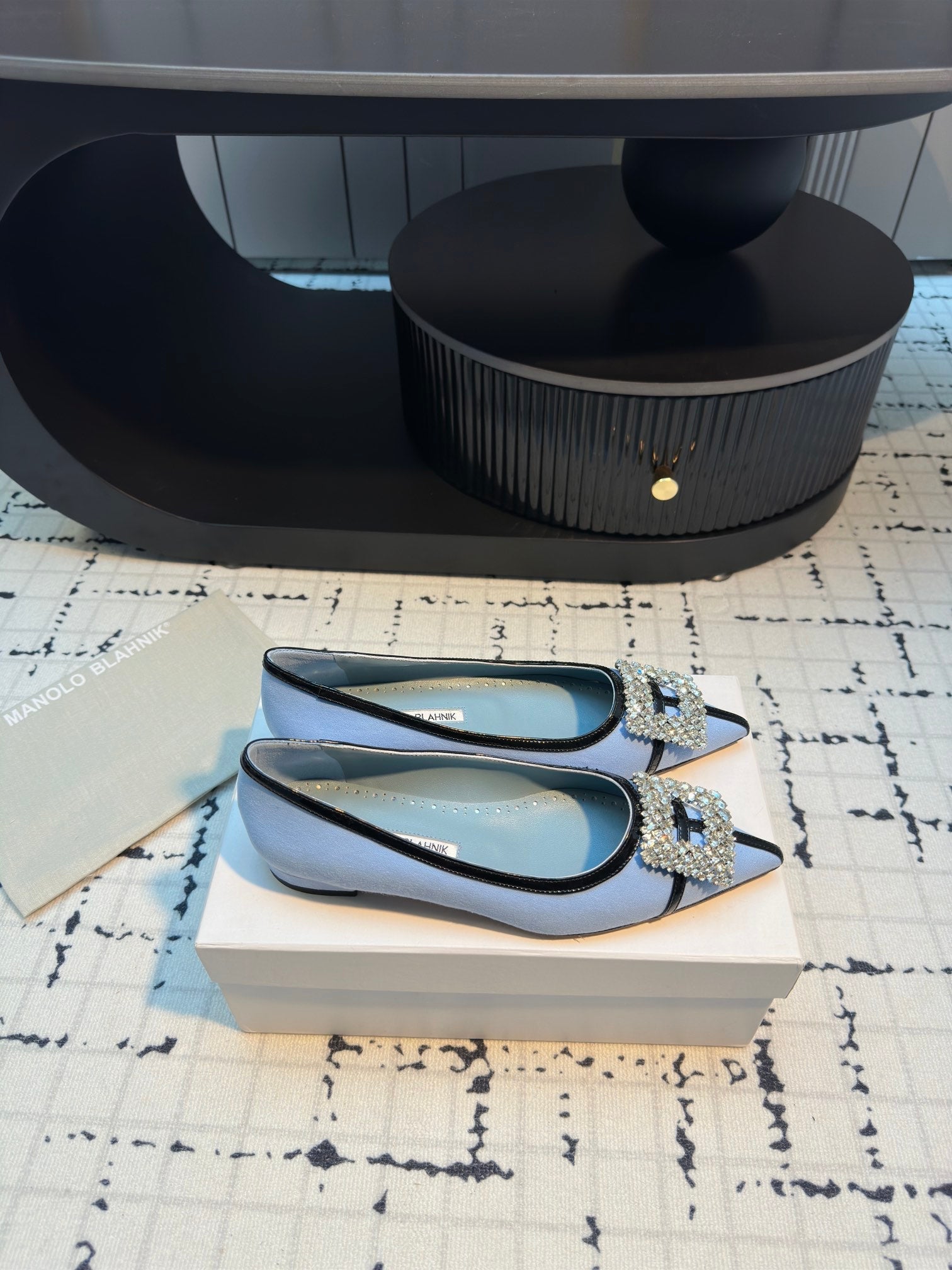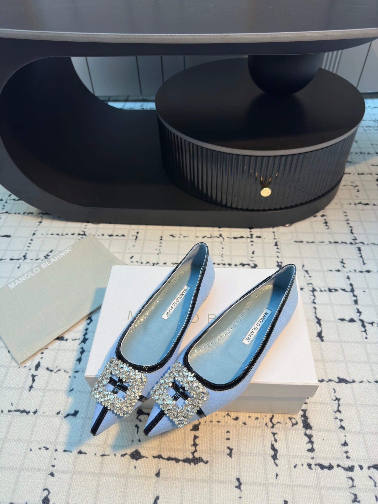 Hangisi 10mm Ballet Flat Ocean Blue Linen with Black Leather Jewel Buckle 161062