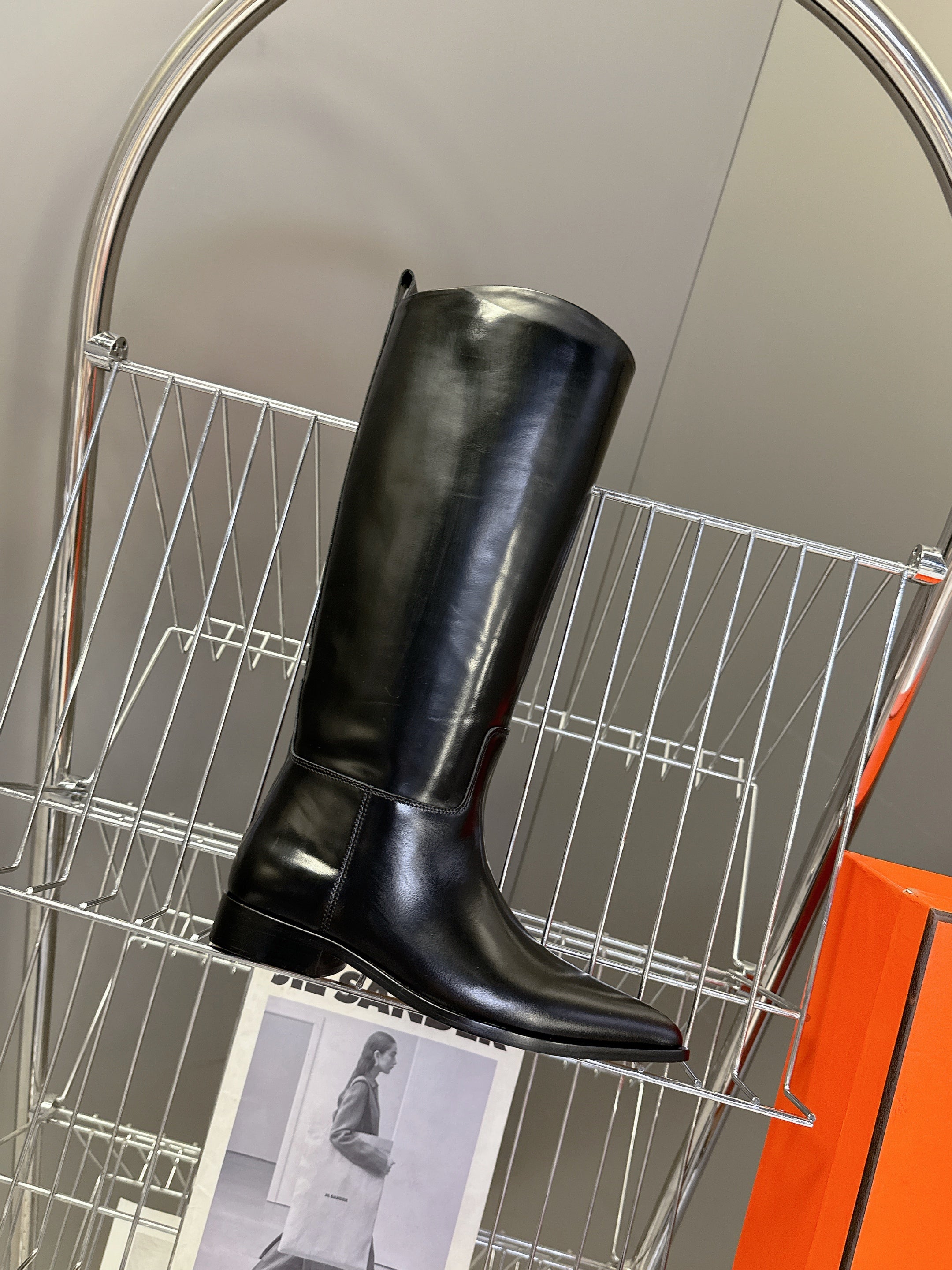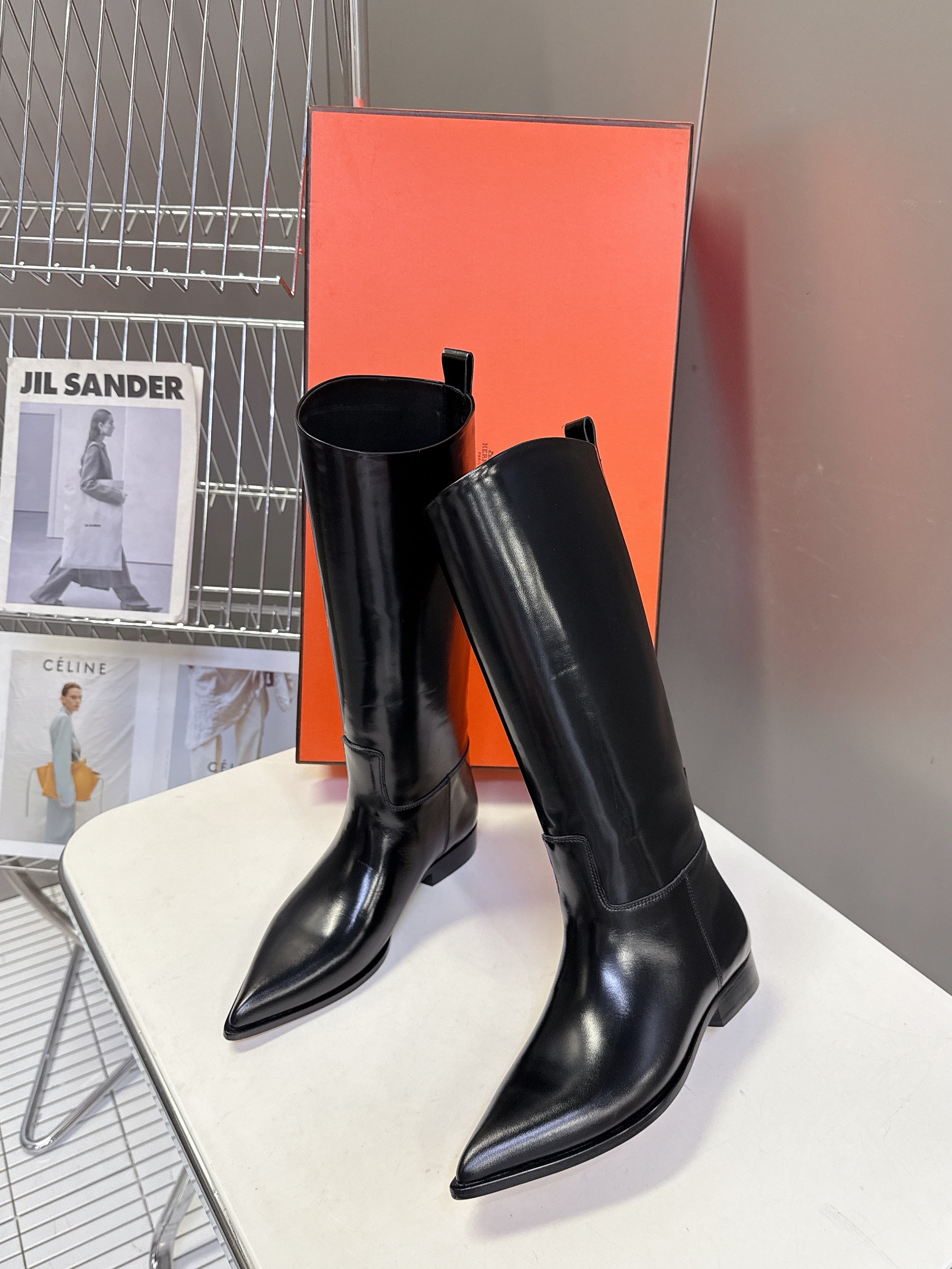 HM 25S POINTED-TOE KNEE-HIGH BOOTS IN BLACK GLOSSY LAMBSKIN