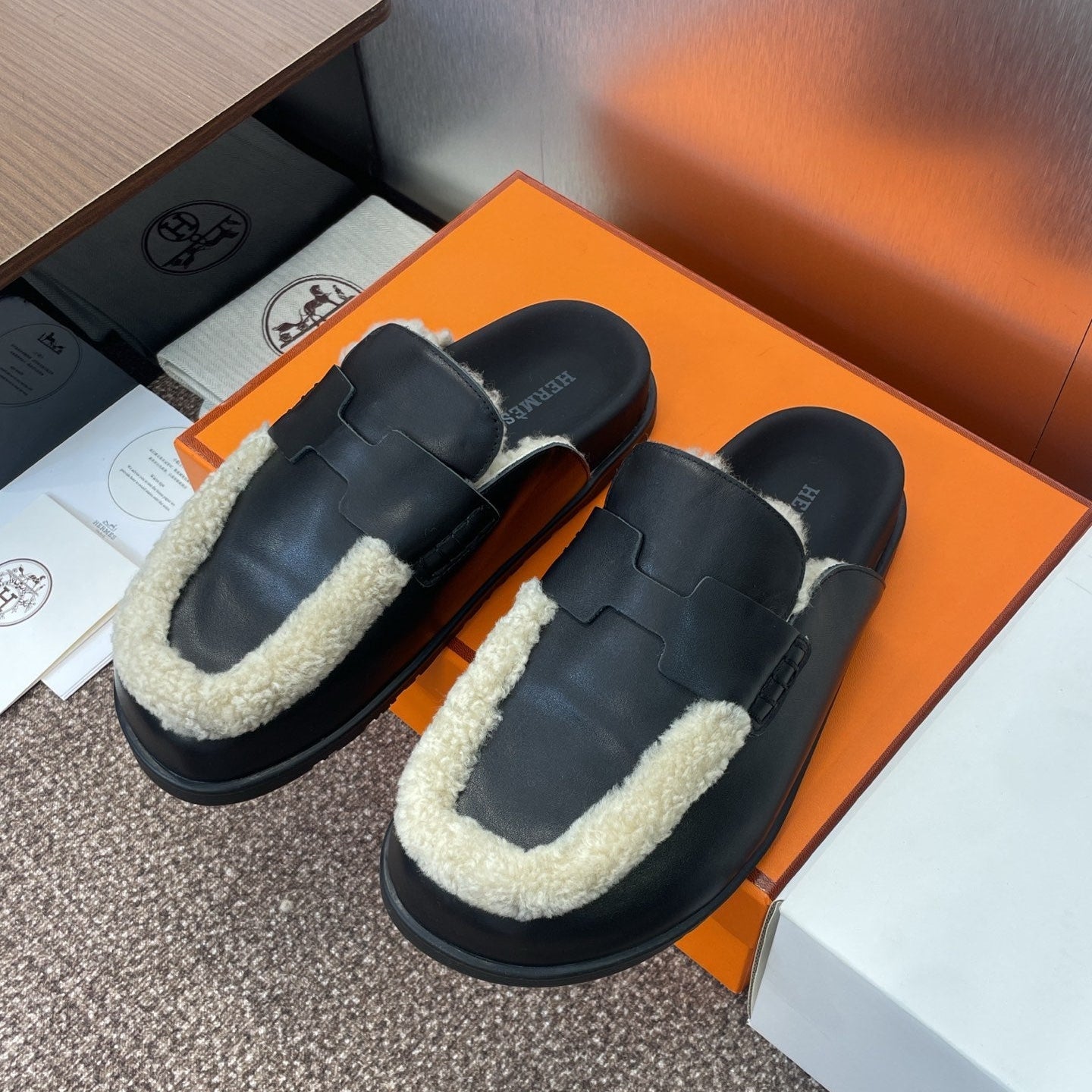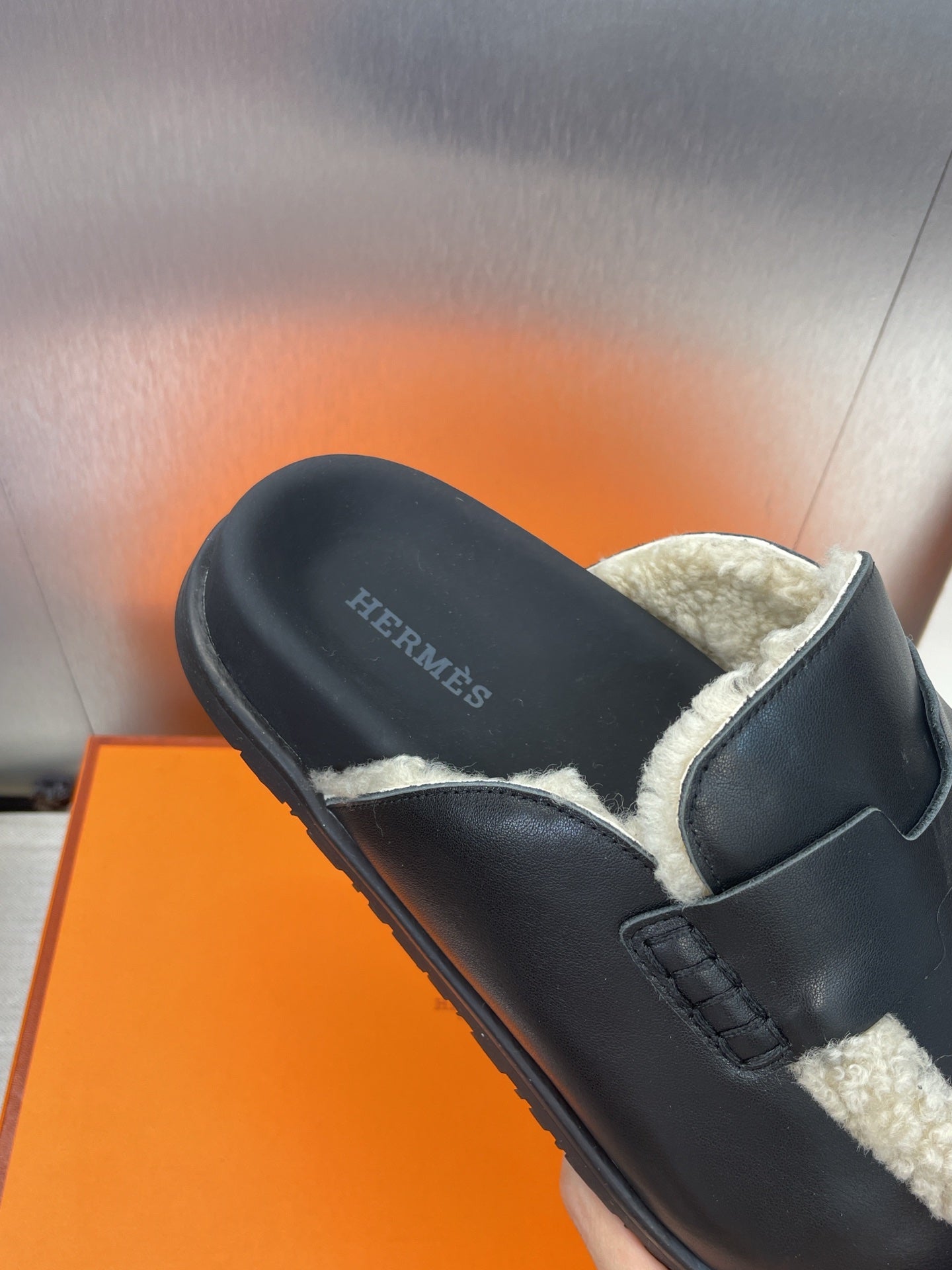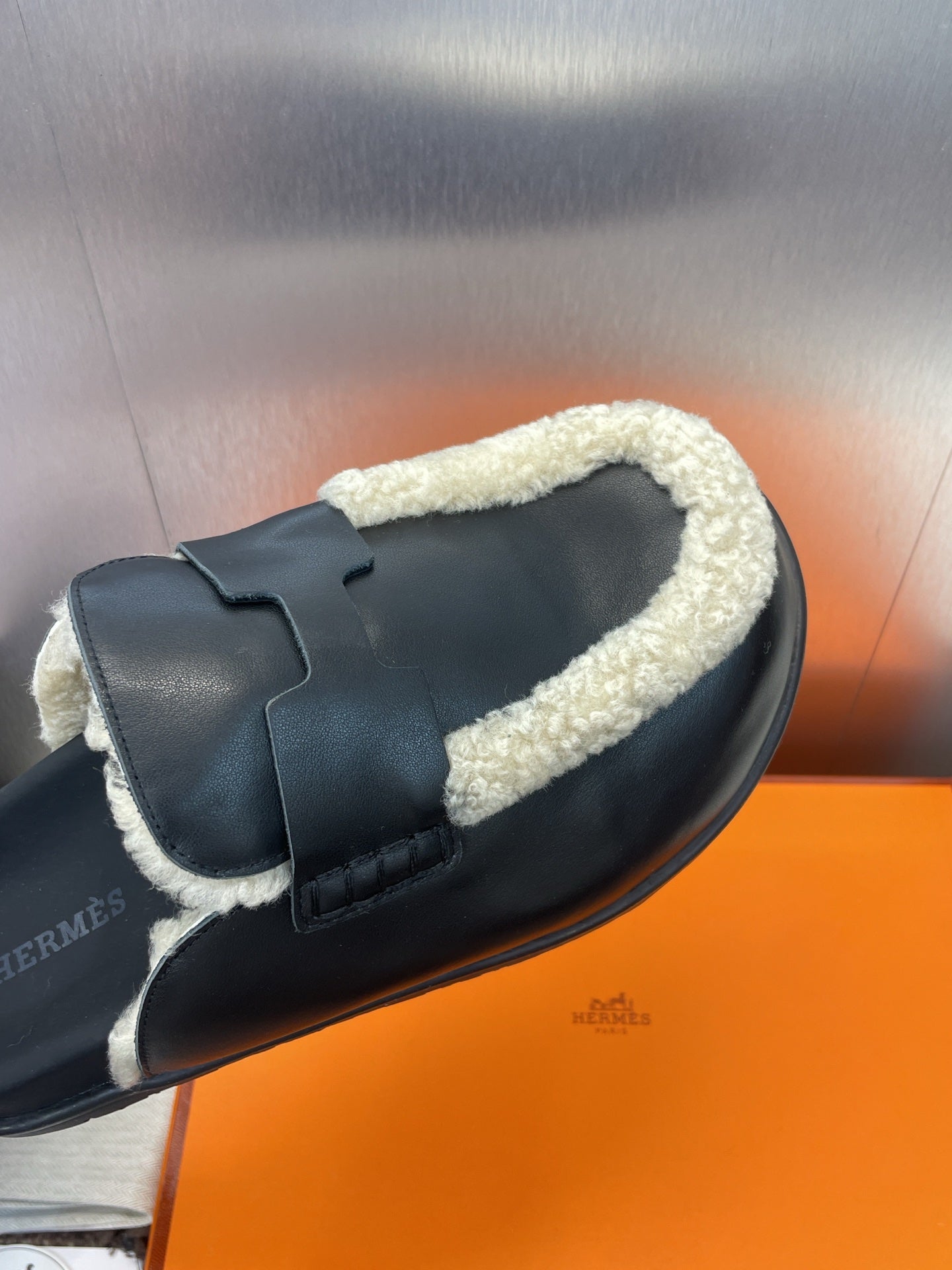 HM MULE IN BLACK CALFSKIN AND WHITE SHEARLING