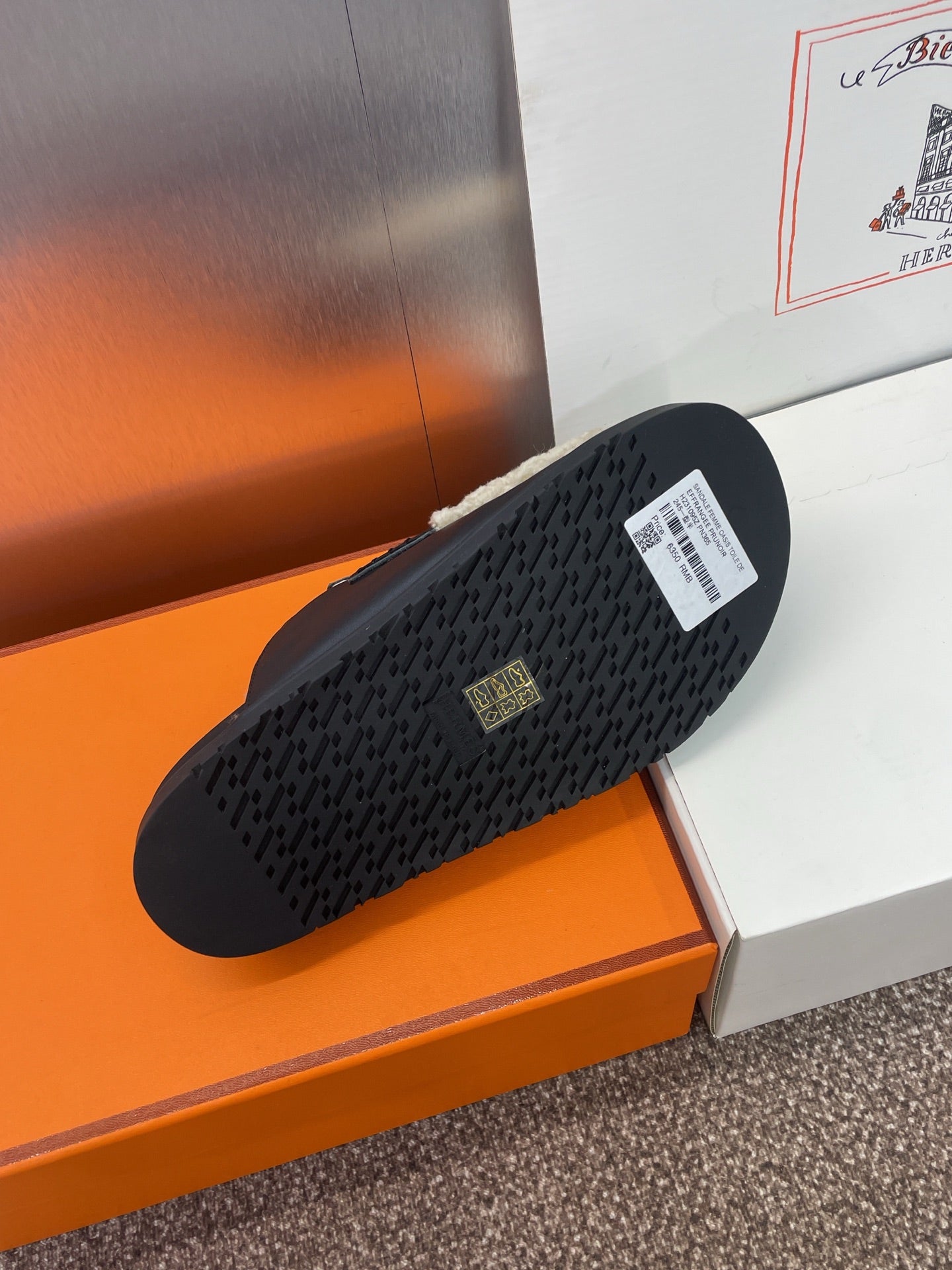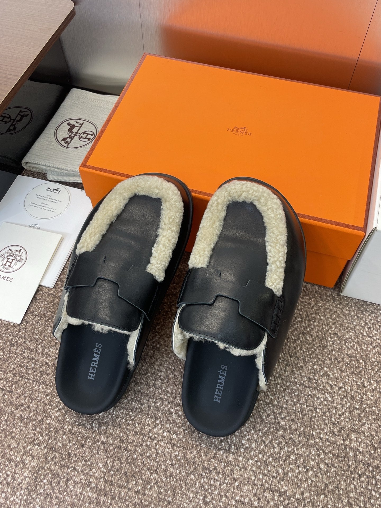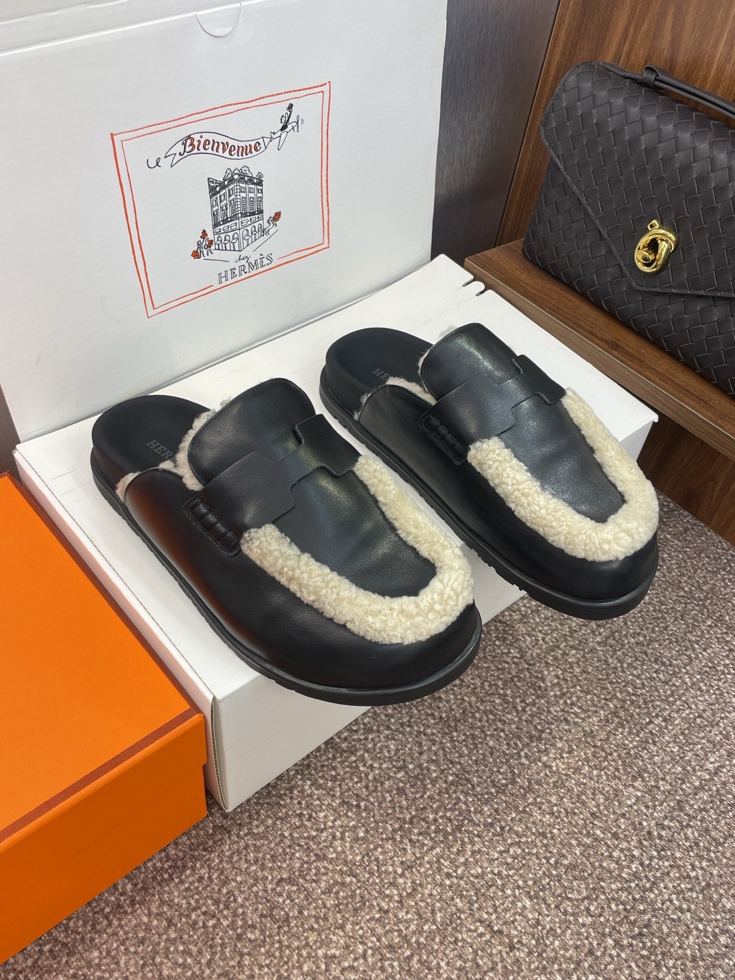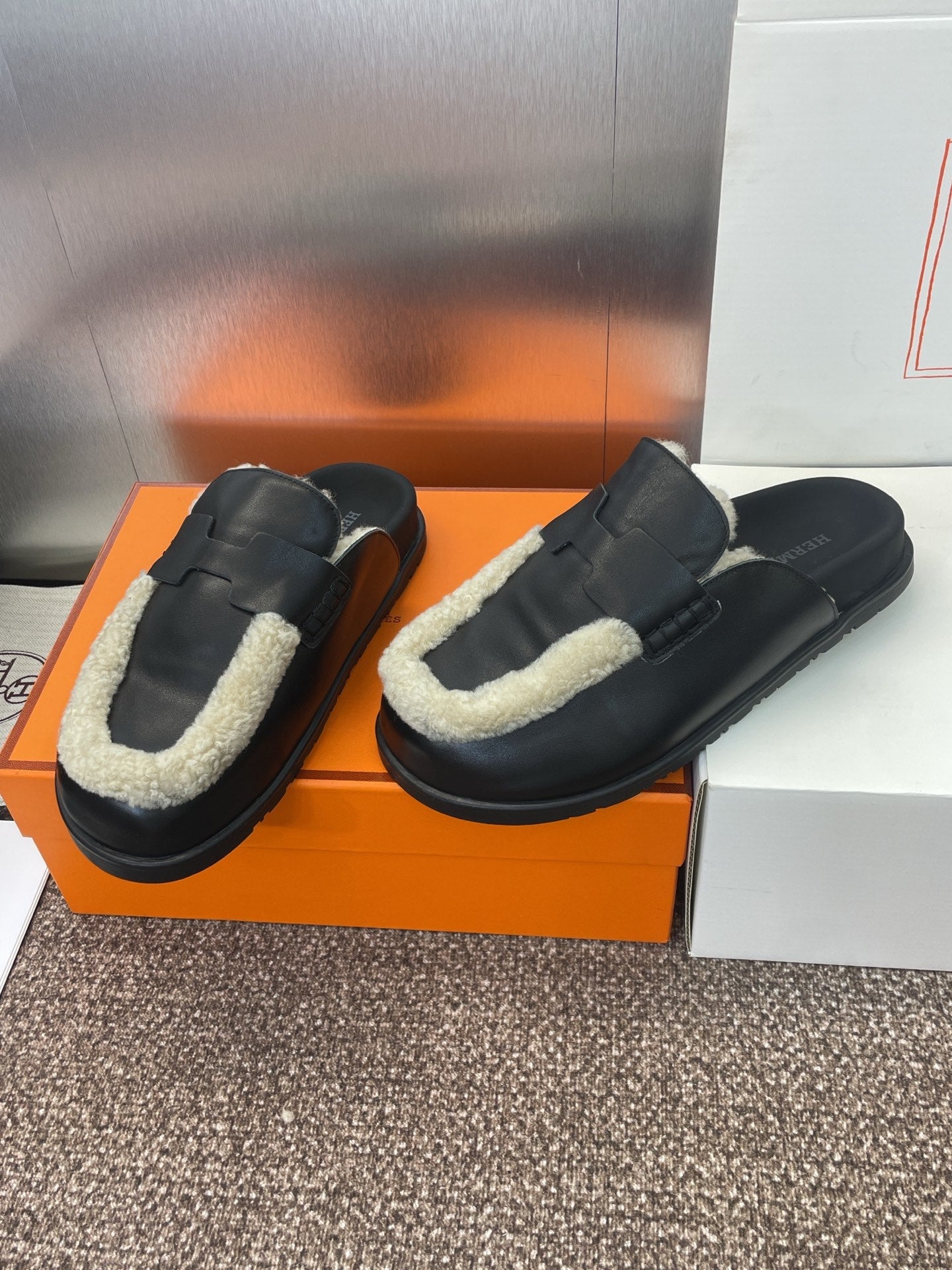 HM MULE IN BLACK CALFSKIN AND WHITE SHEARLING