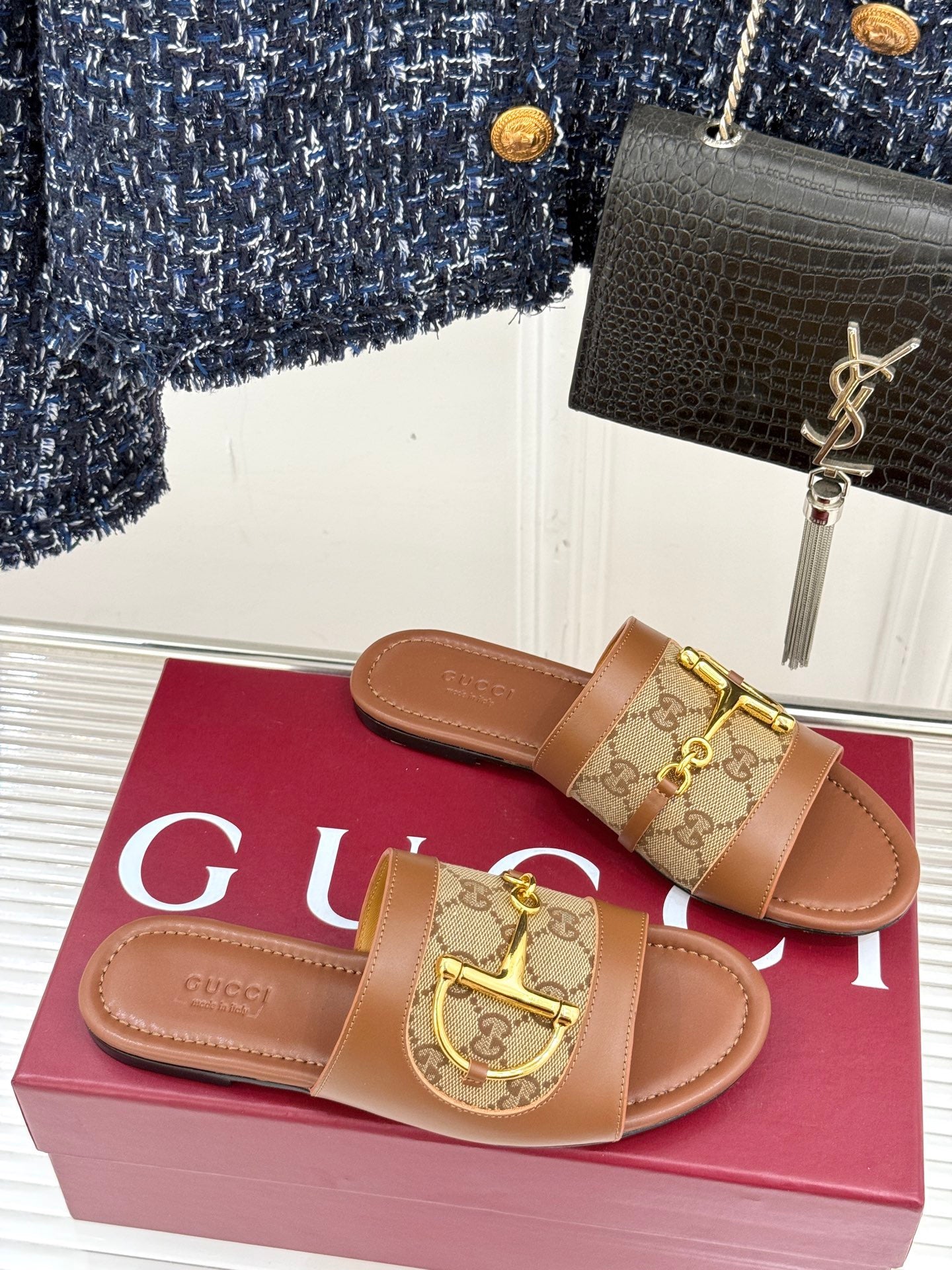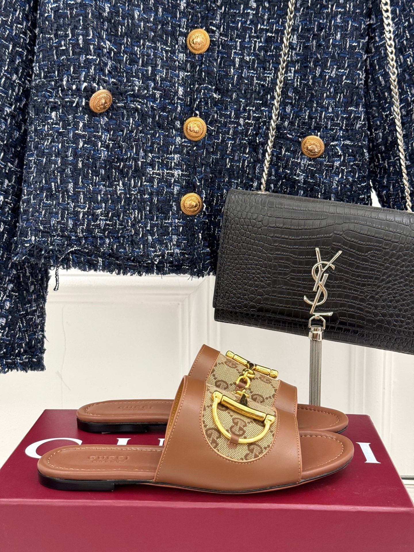 HORSEBIT SLIDE SANDALS BROWN CANVAS AND LEATHER WITH GOLD HARDWARE