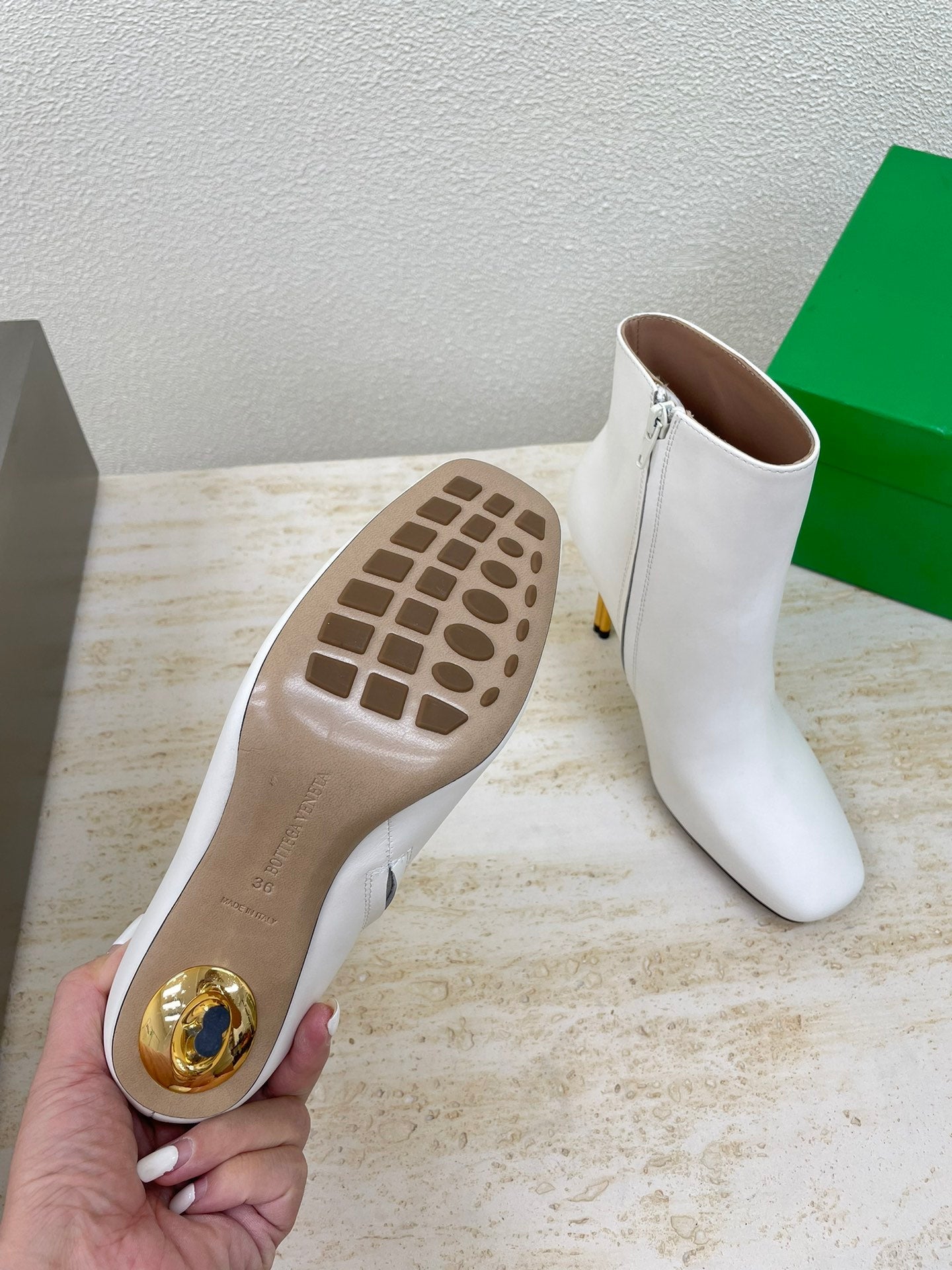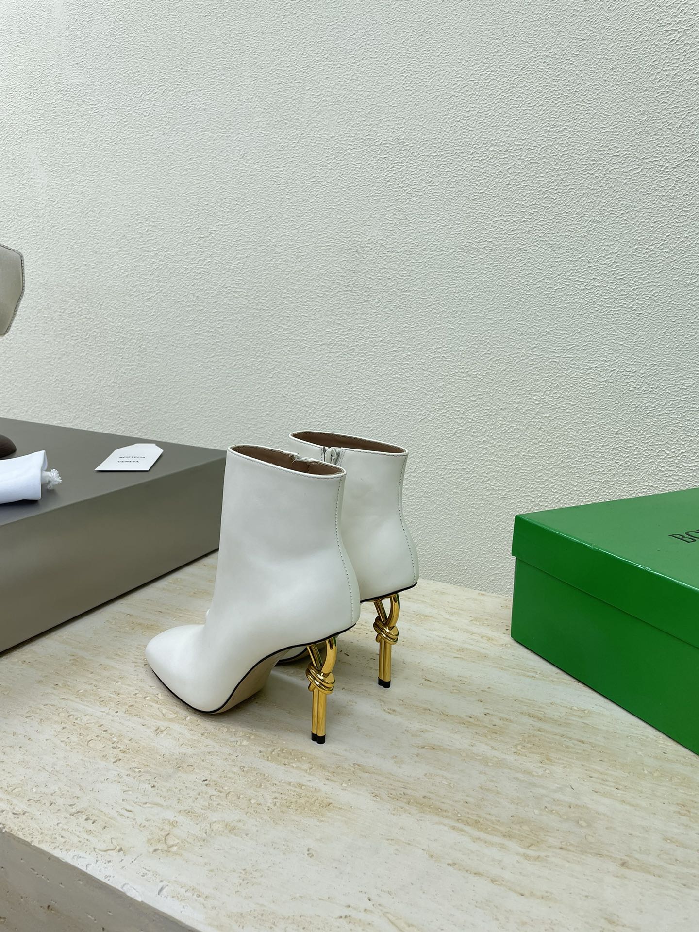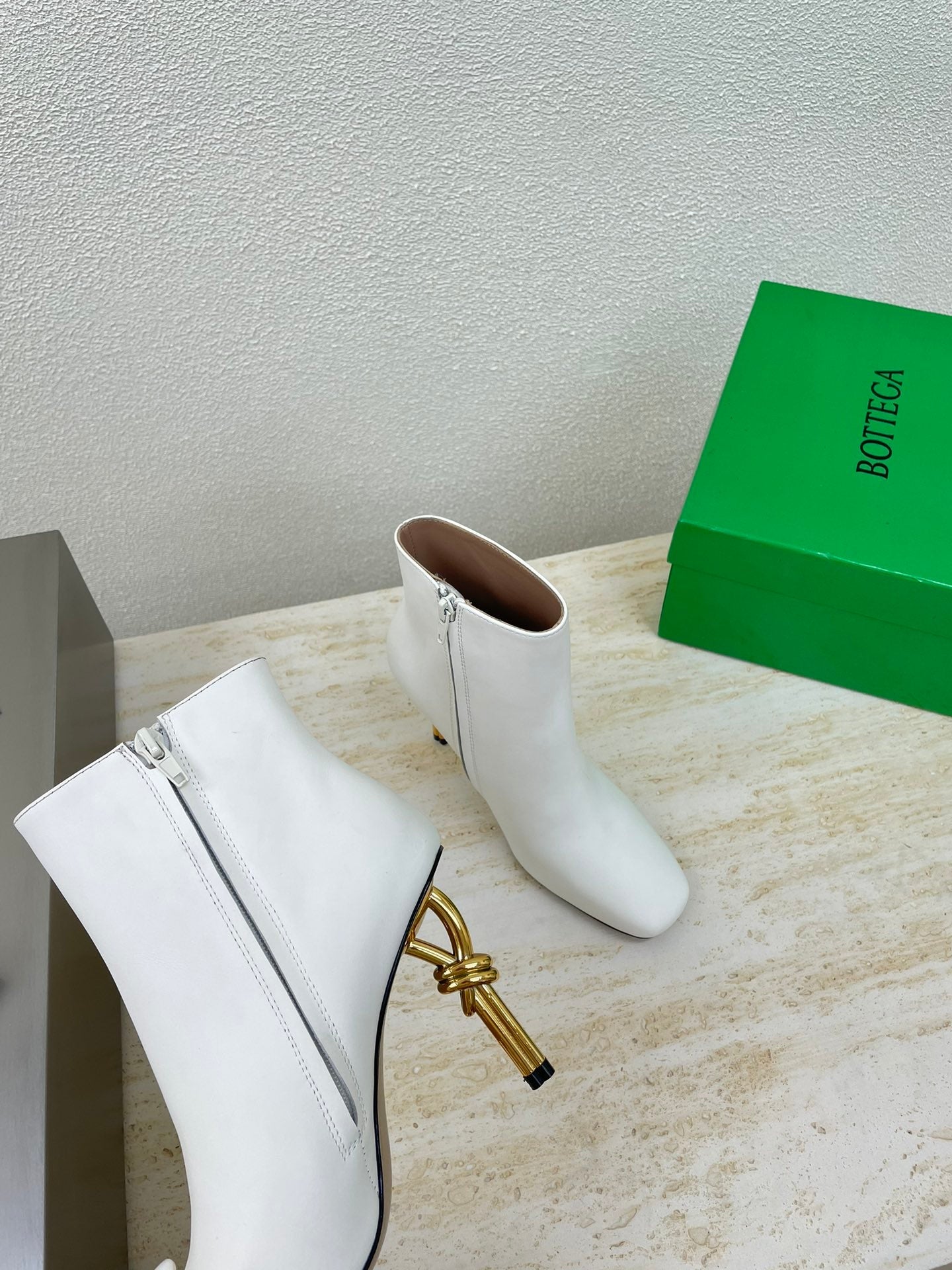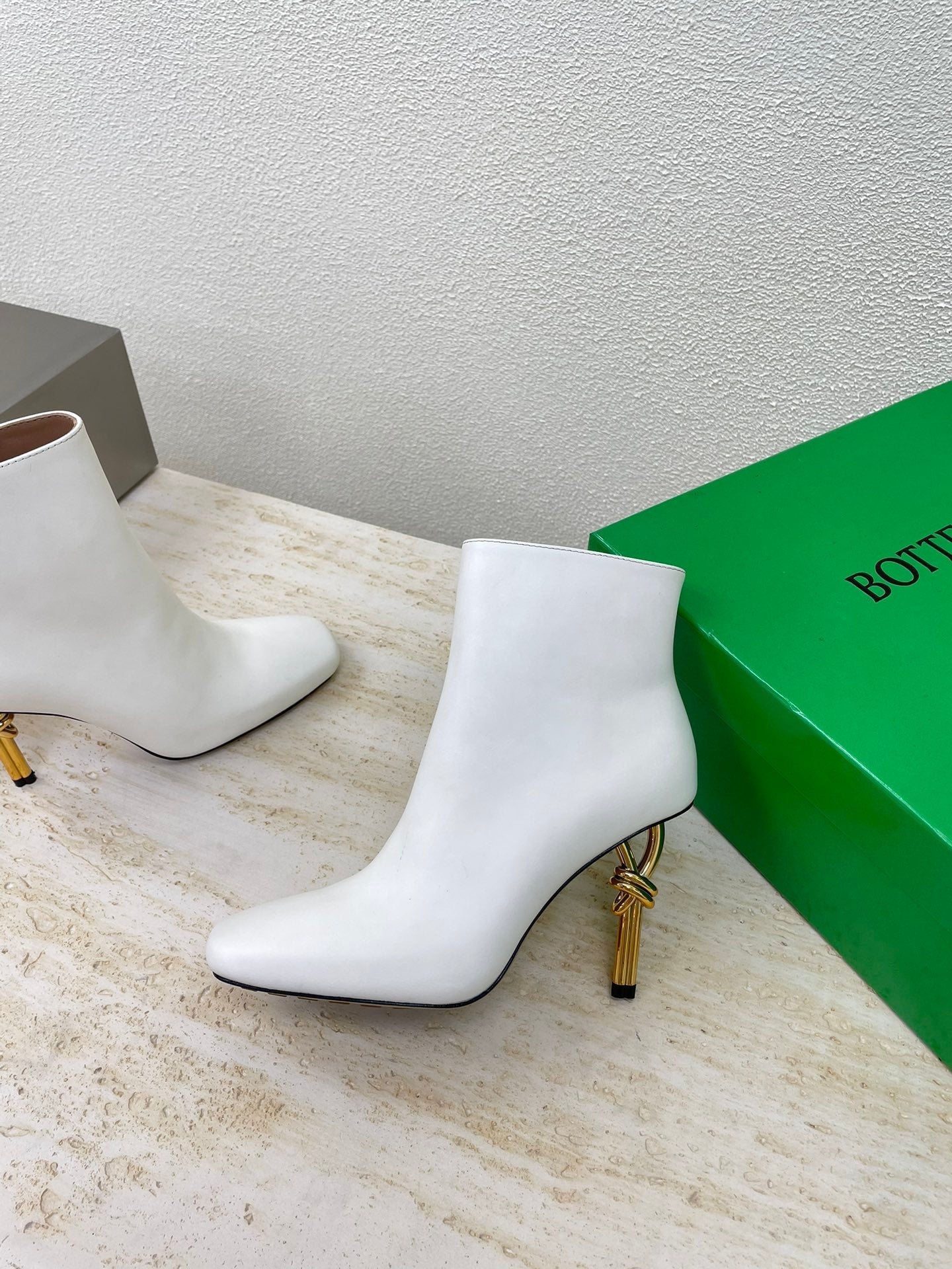 KNOT ANKLE BOOT IN WHITE CALFSKIN WITH GOLD METAL HEEL 9 CM