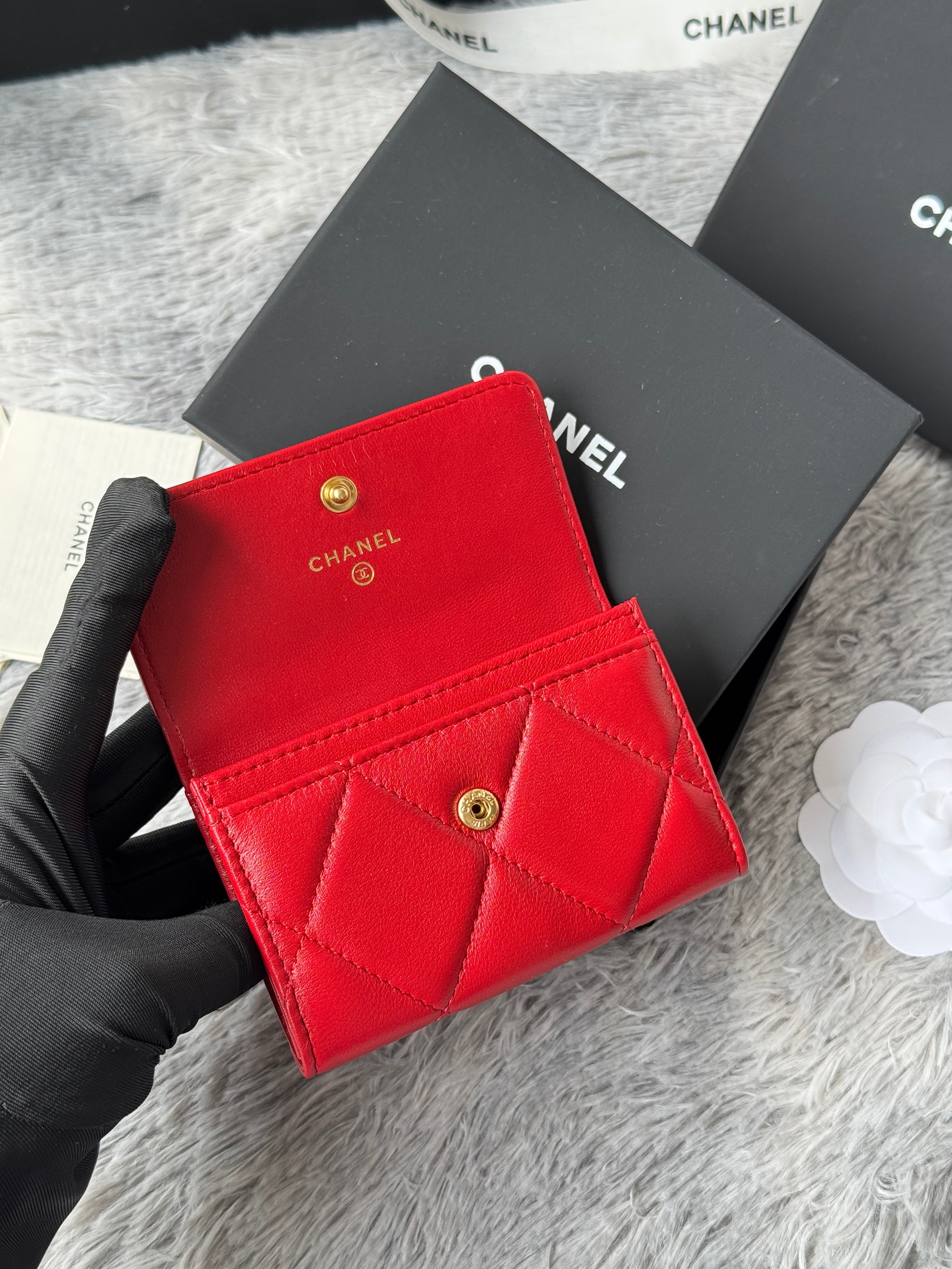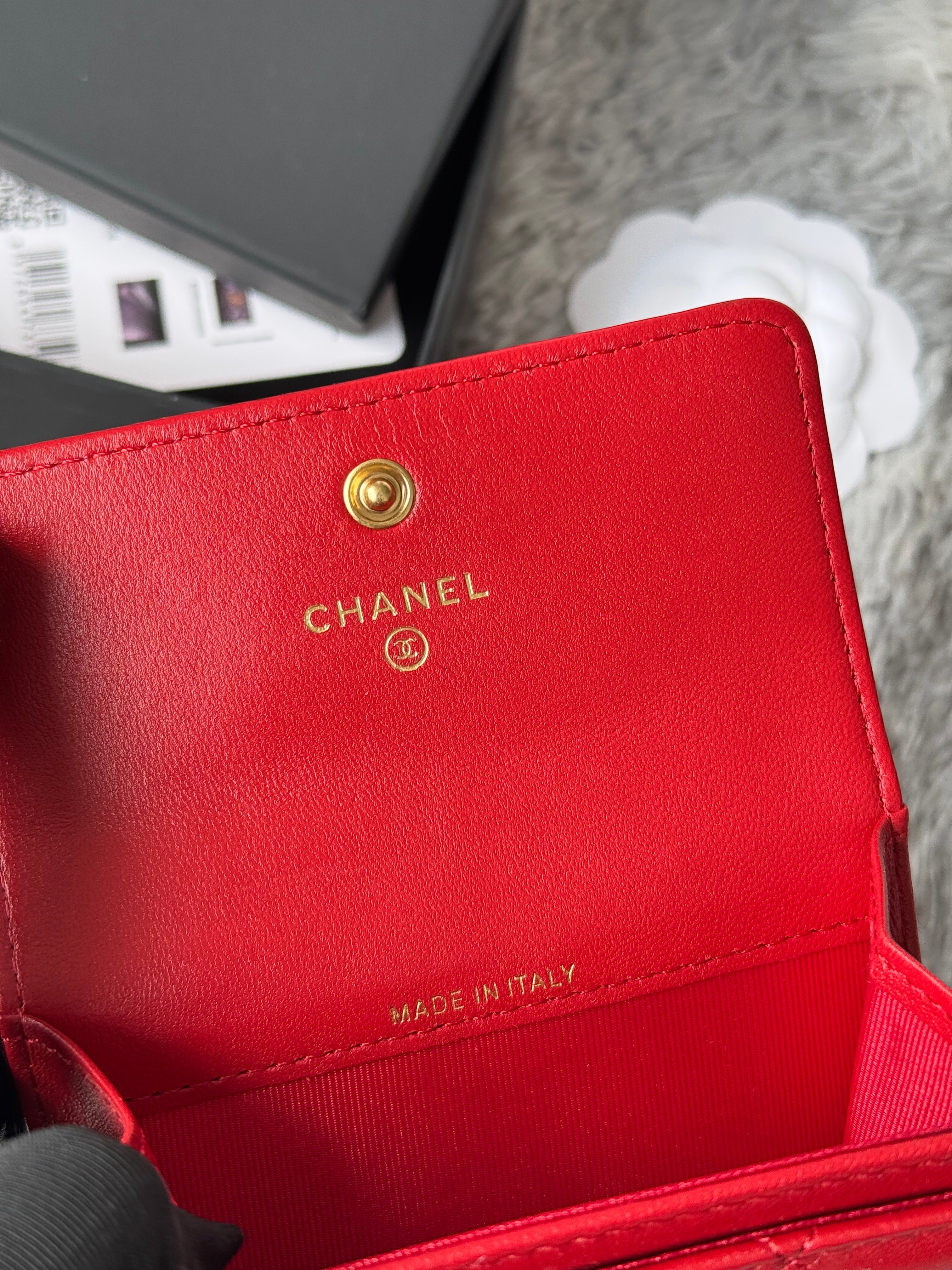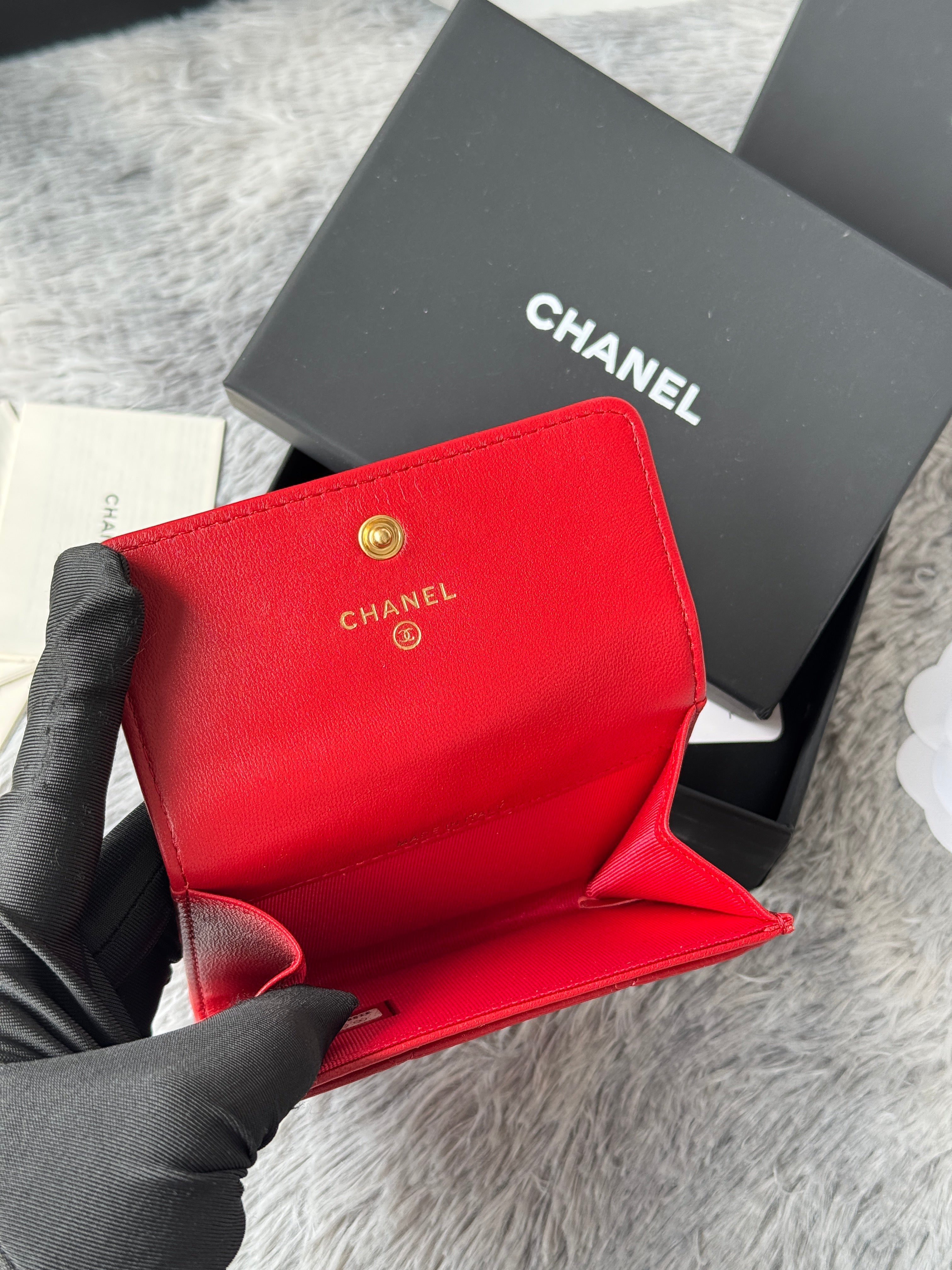 MINI FLAP CARD HOLDER 11 IN RED LAMBSKIN GOLD-TONE METALLIC