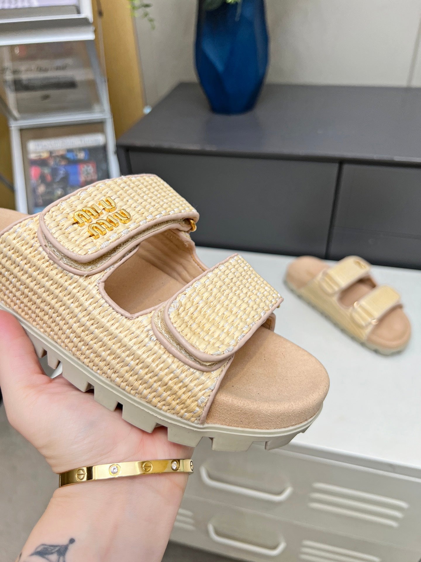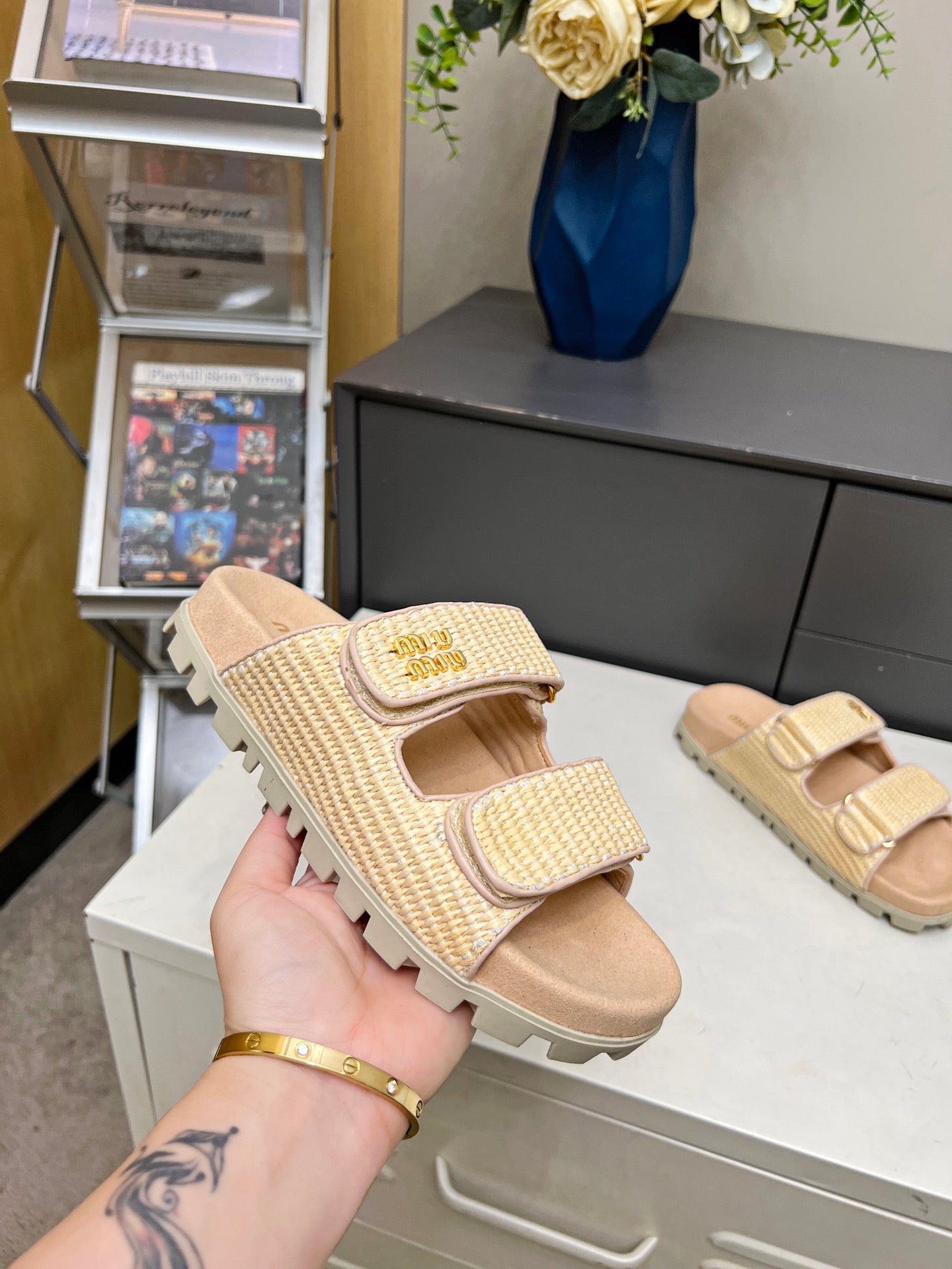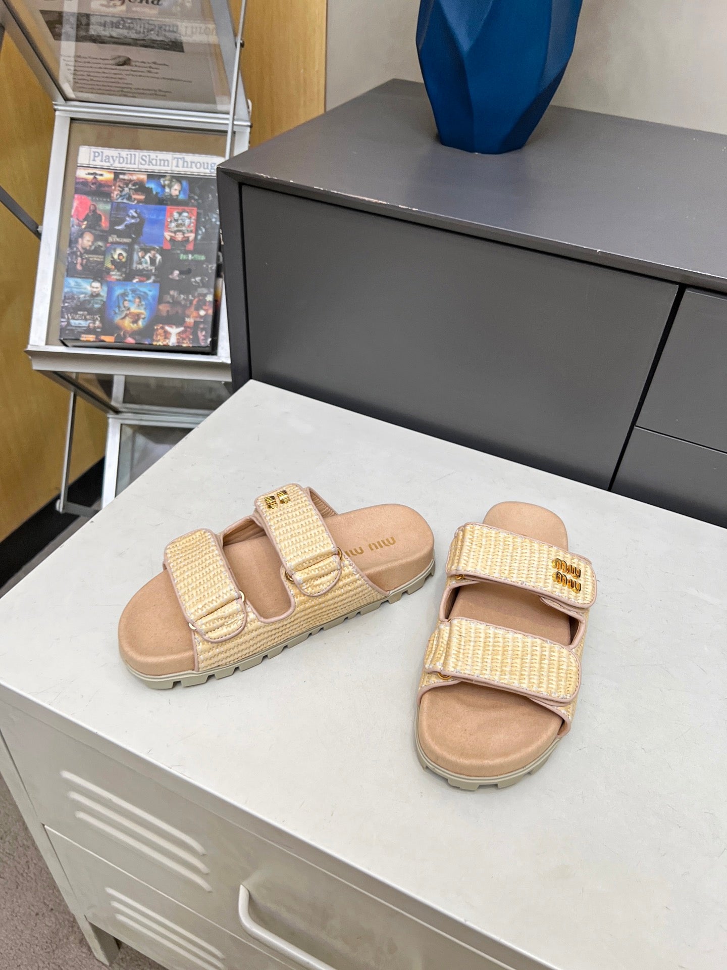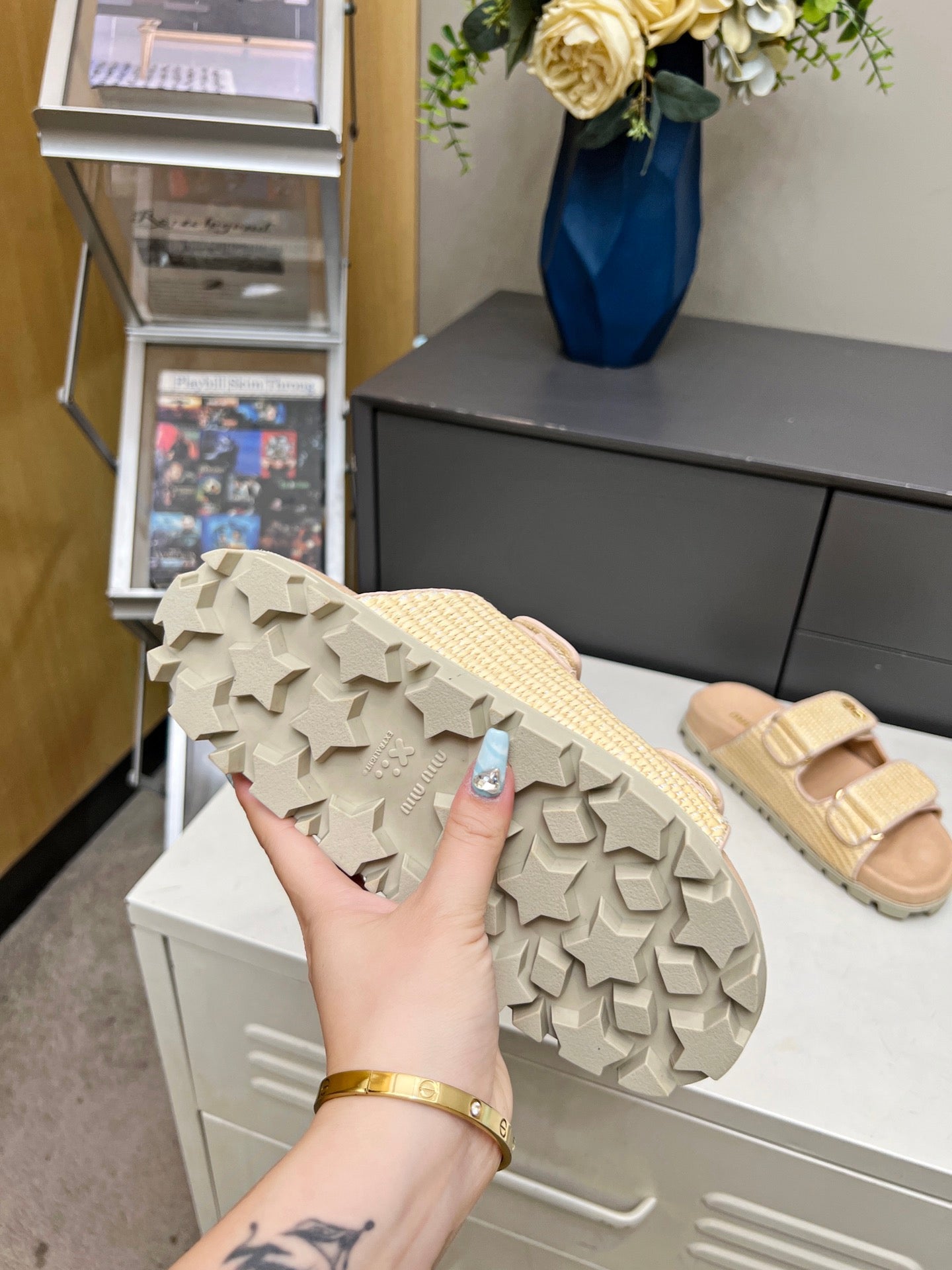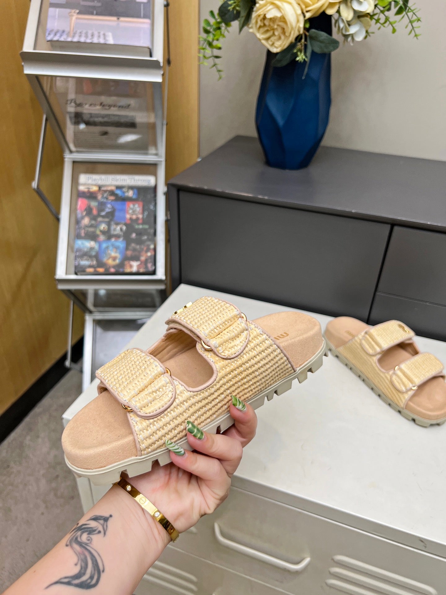 MM DOUBLE STRAP FLAT SANDALS IN BEIGE RAFFIA
