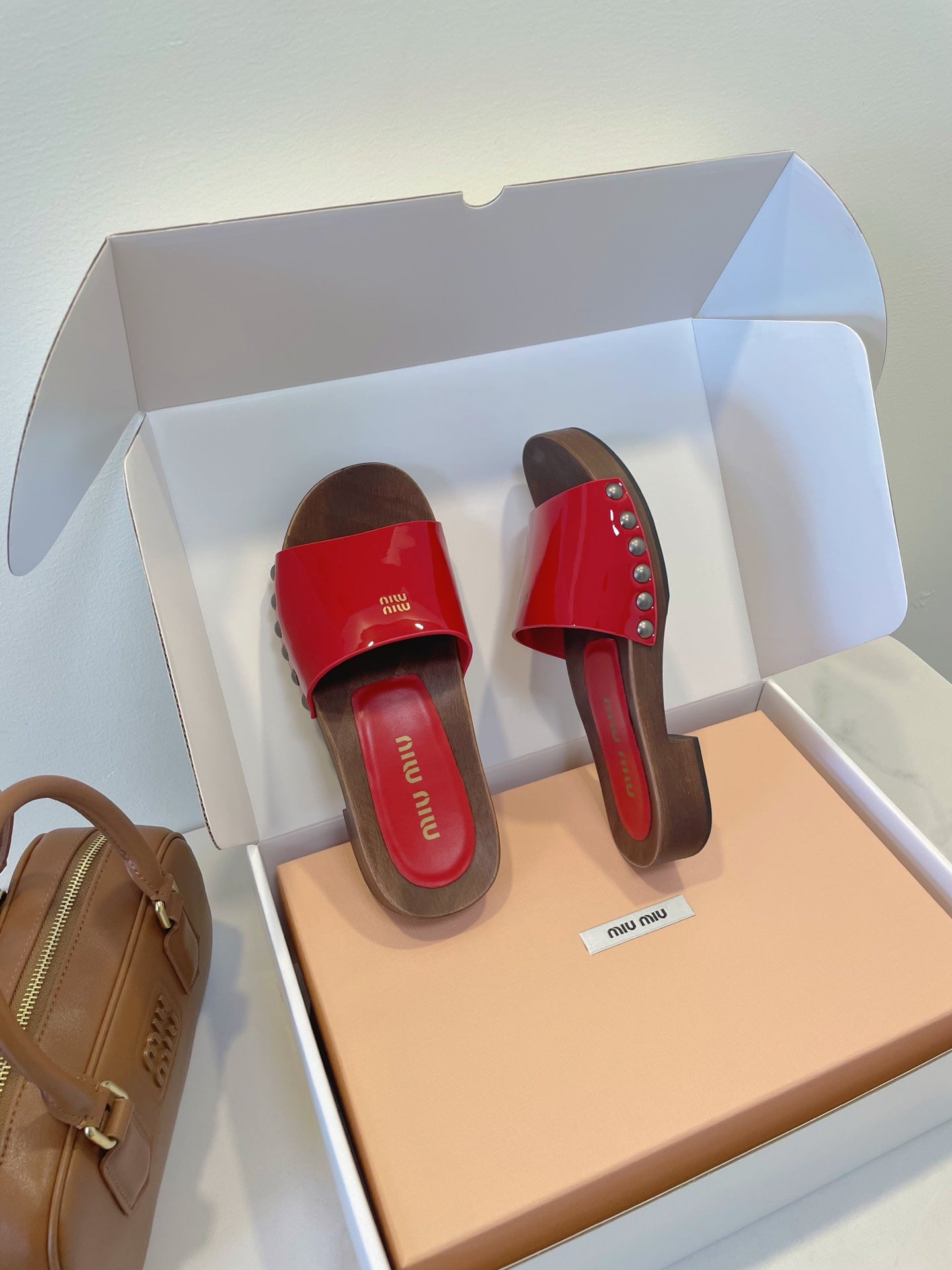 MM STUDDED SANDALS IN RED PATENT CALFSKIN AND WOOD