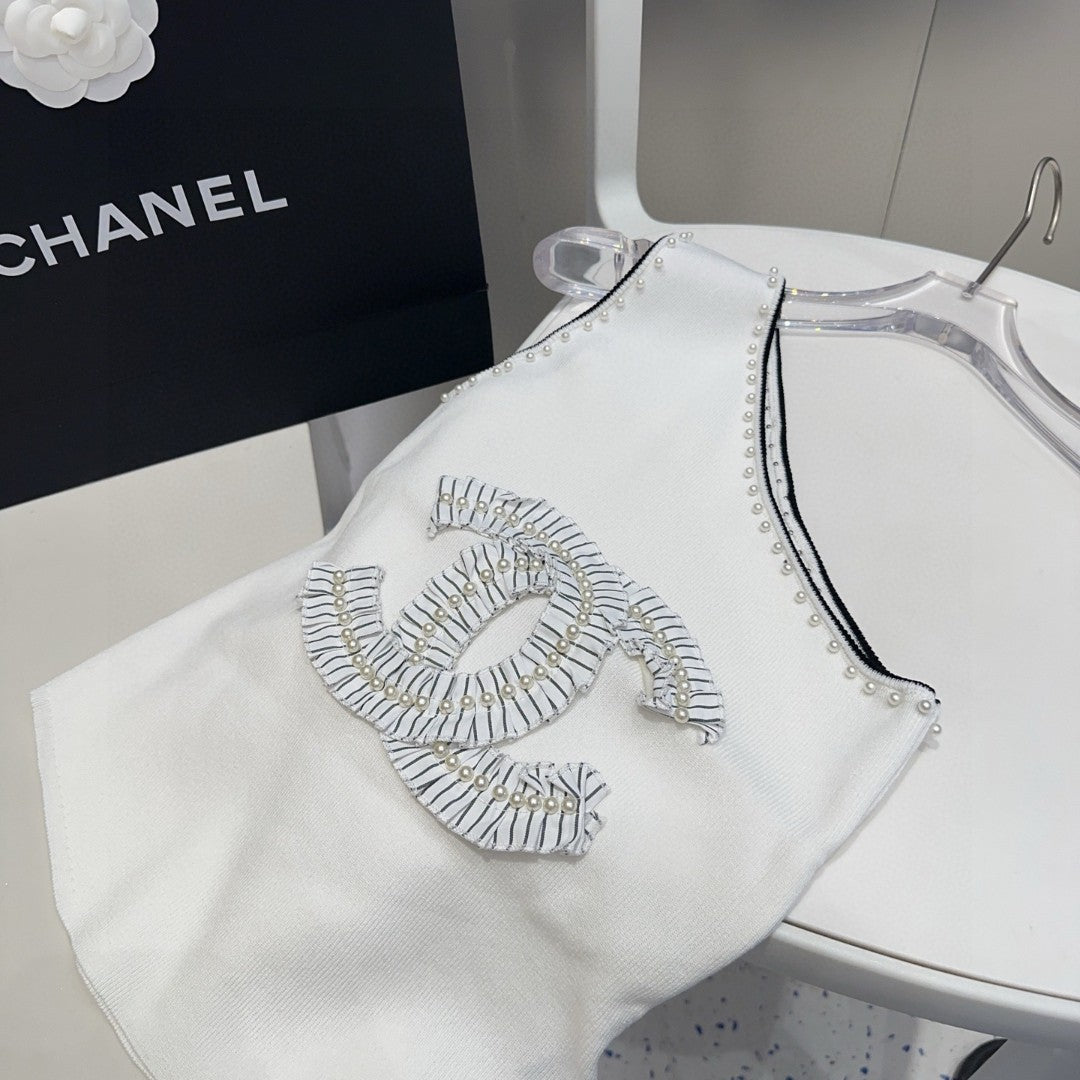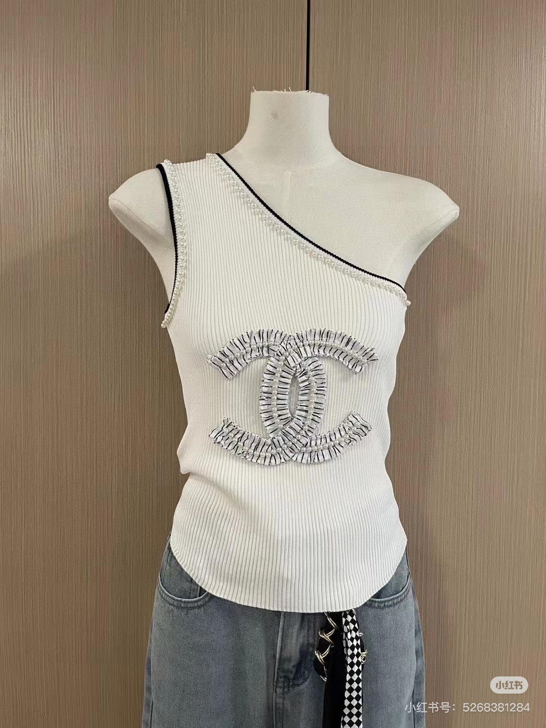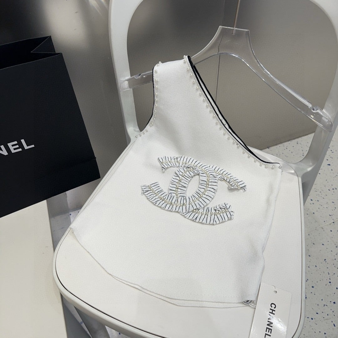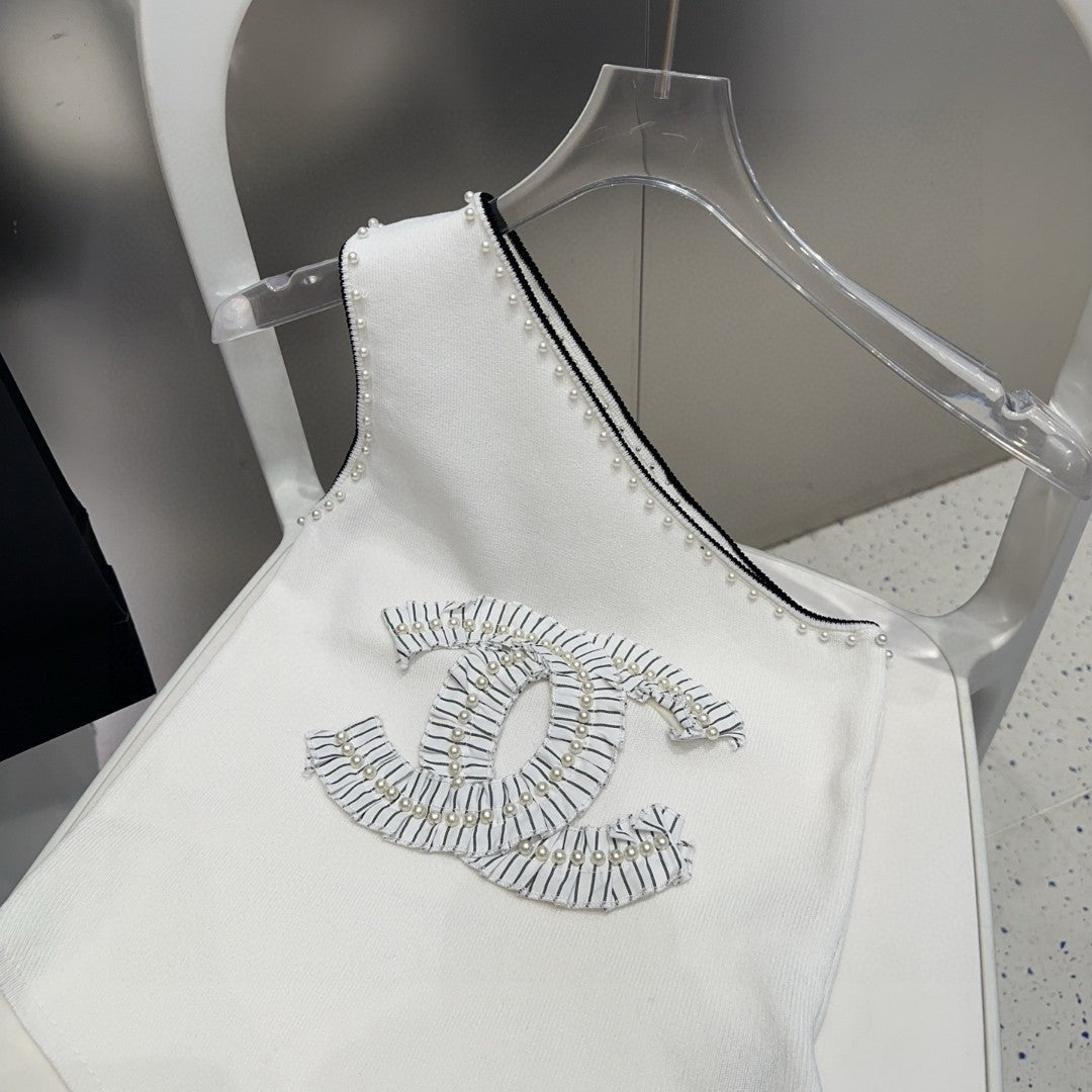 ONE SHOULDER TOP 622140 IN WHITE COTTON EMBOSSED PEARL TRIM