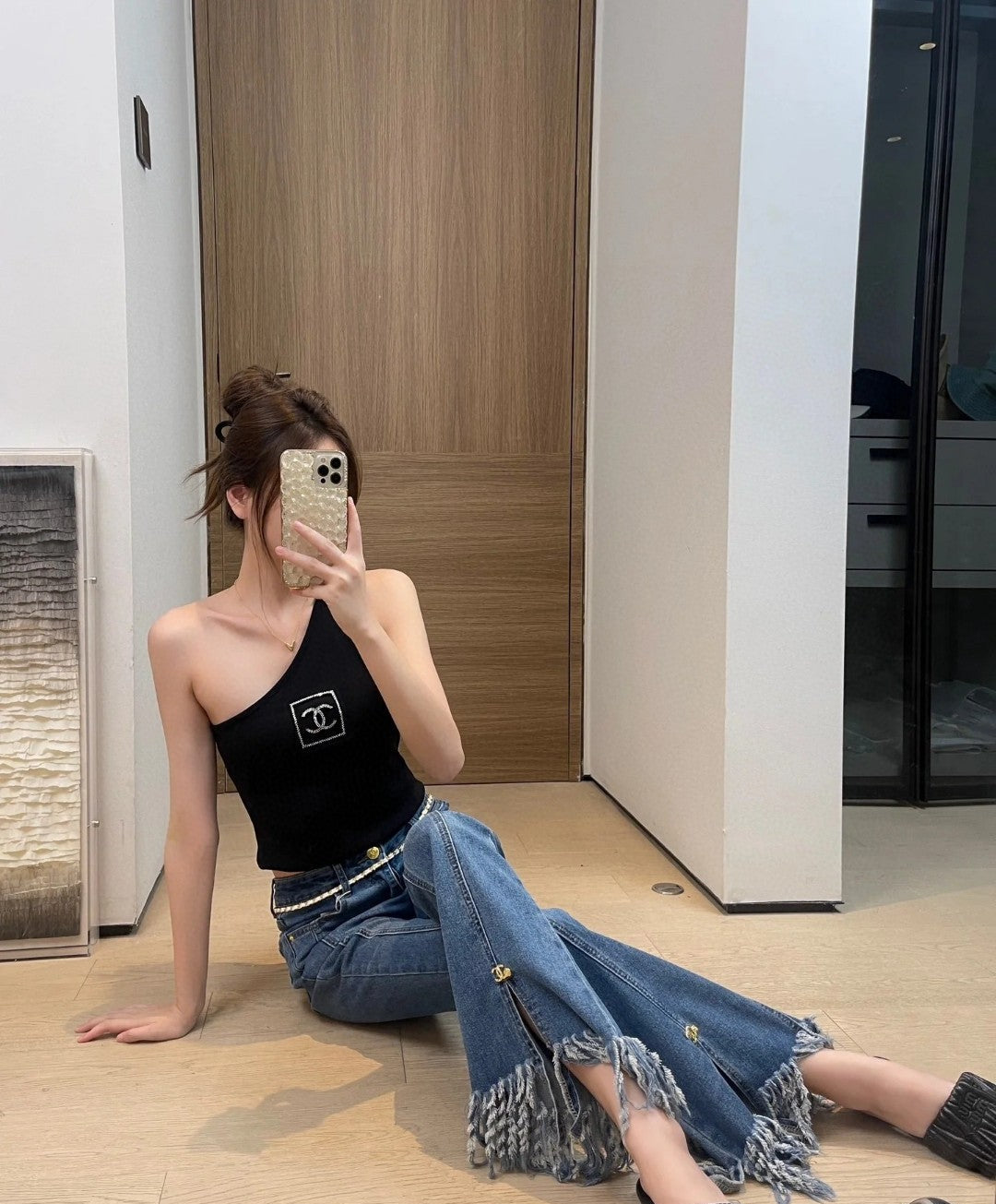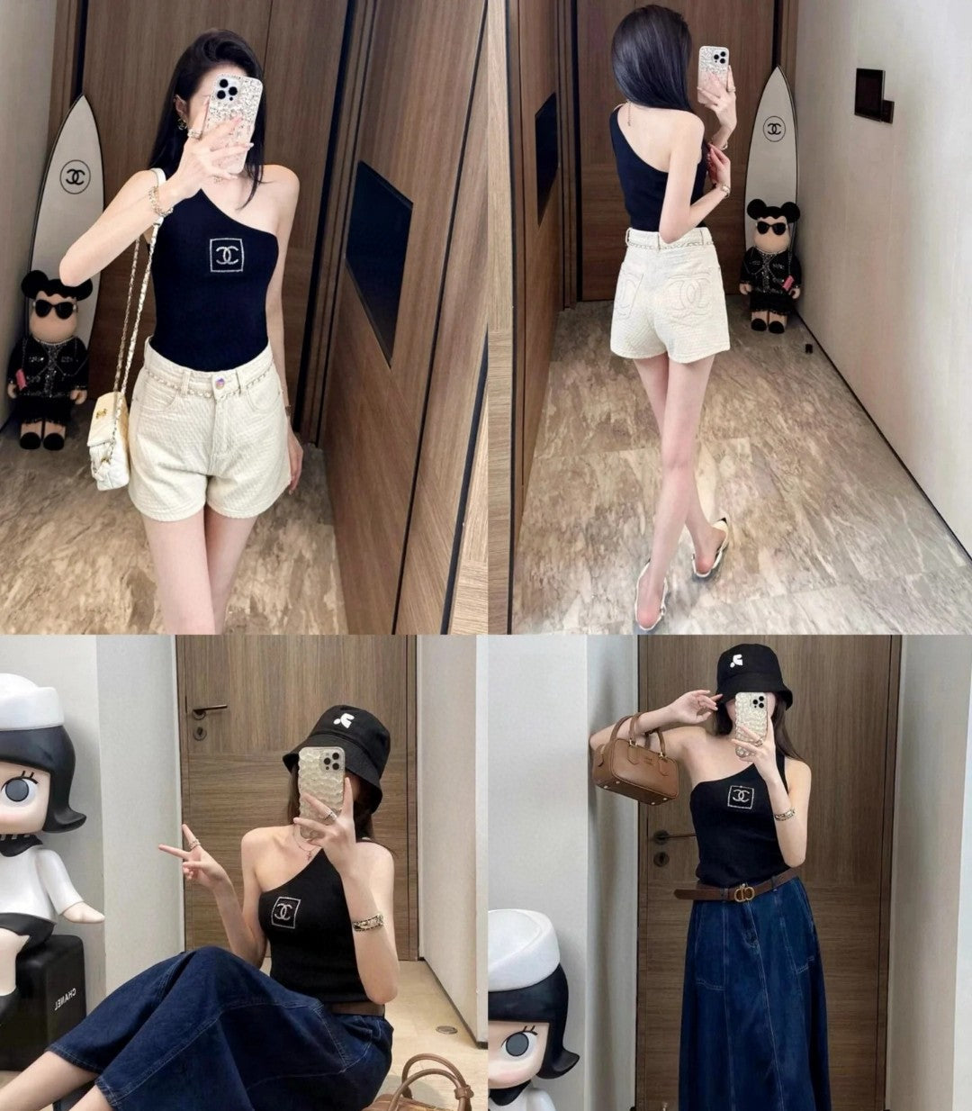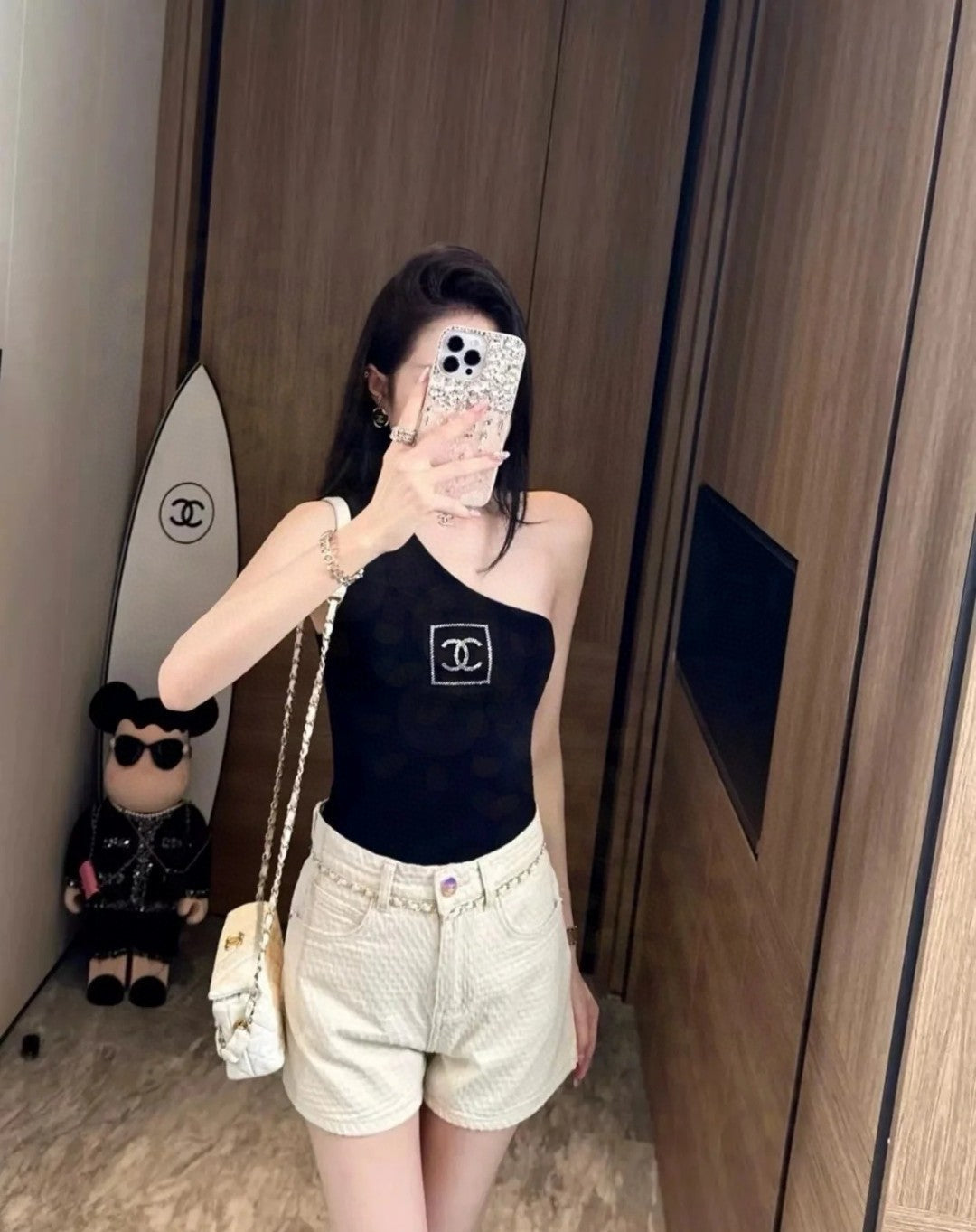ONE SHOULDER TOP 624509 IN BLACK COTTON MULTICOLOR LOGO