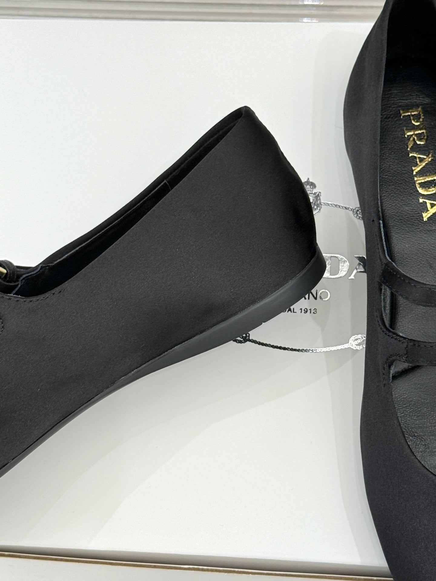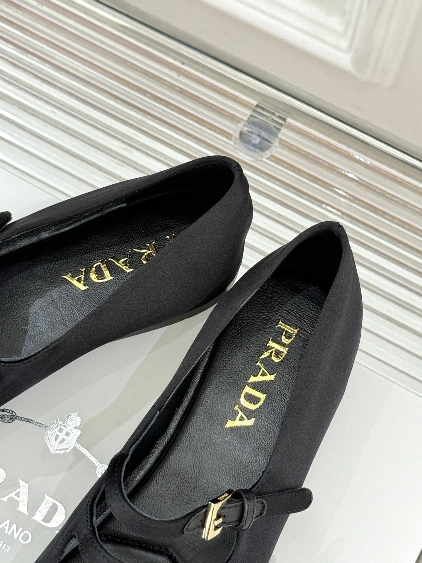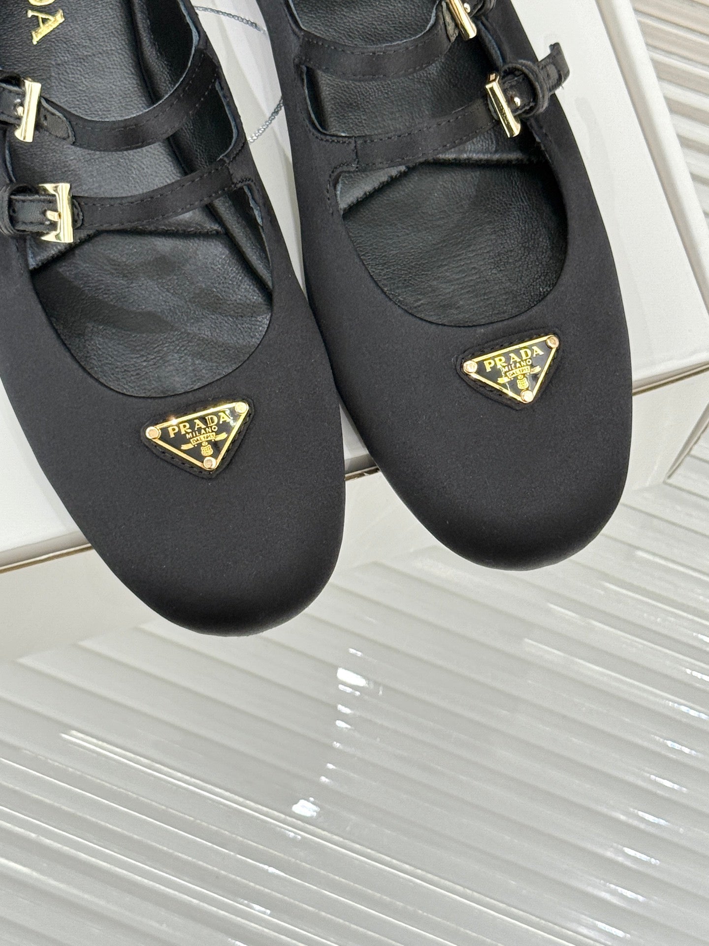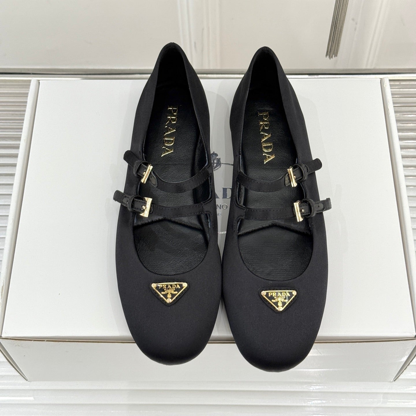 PRADA 25S DOUBLE STRAP BALLERINAS IN BLACK SATIN
