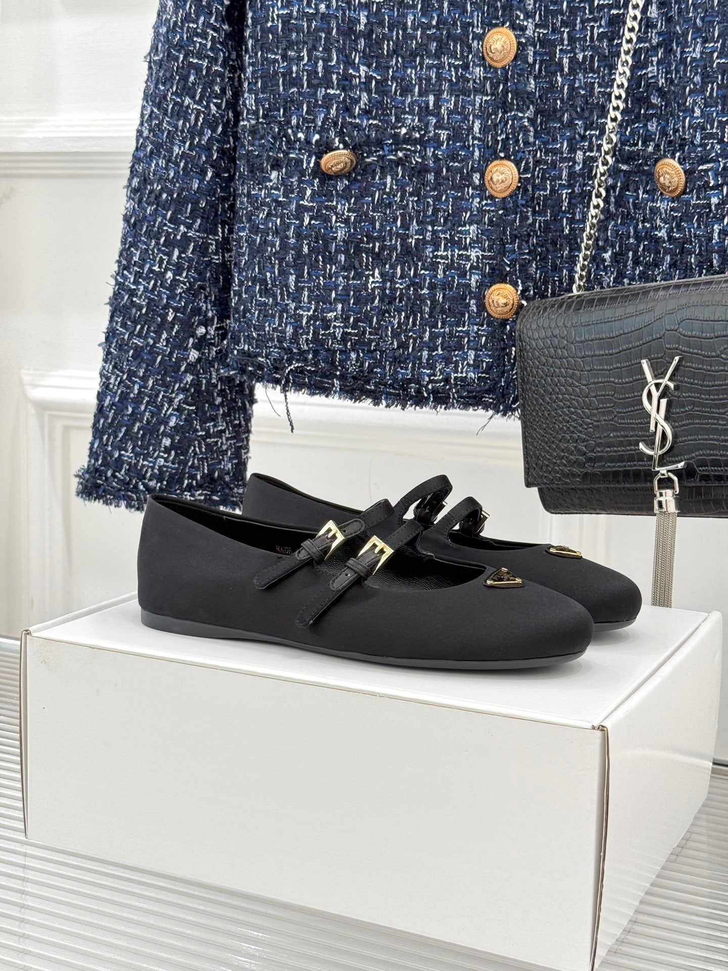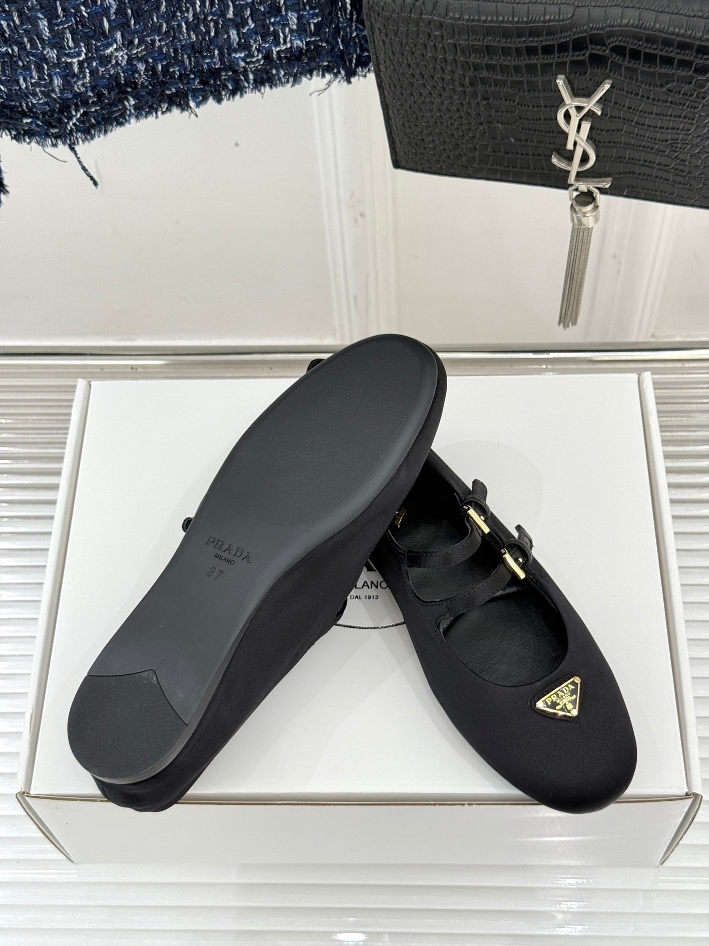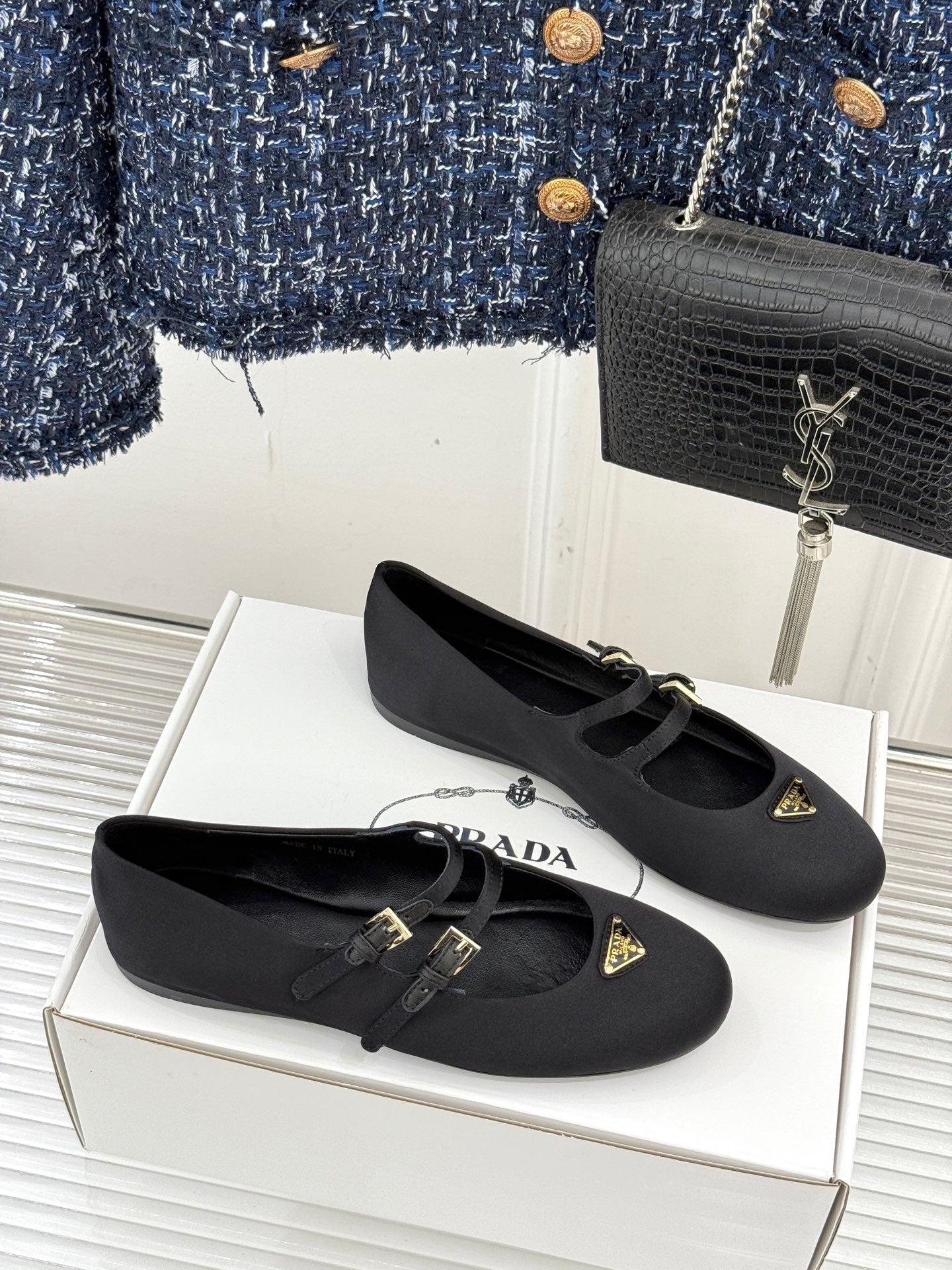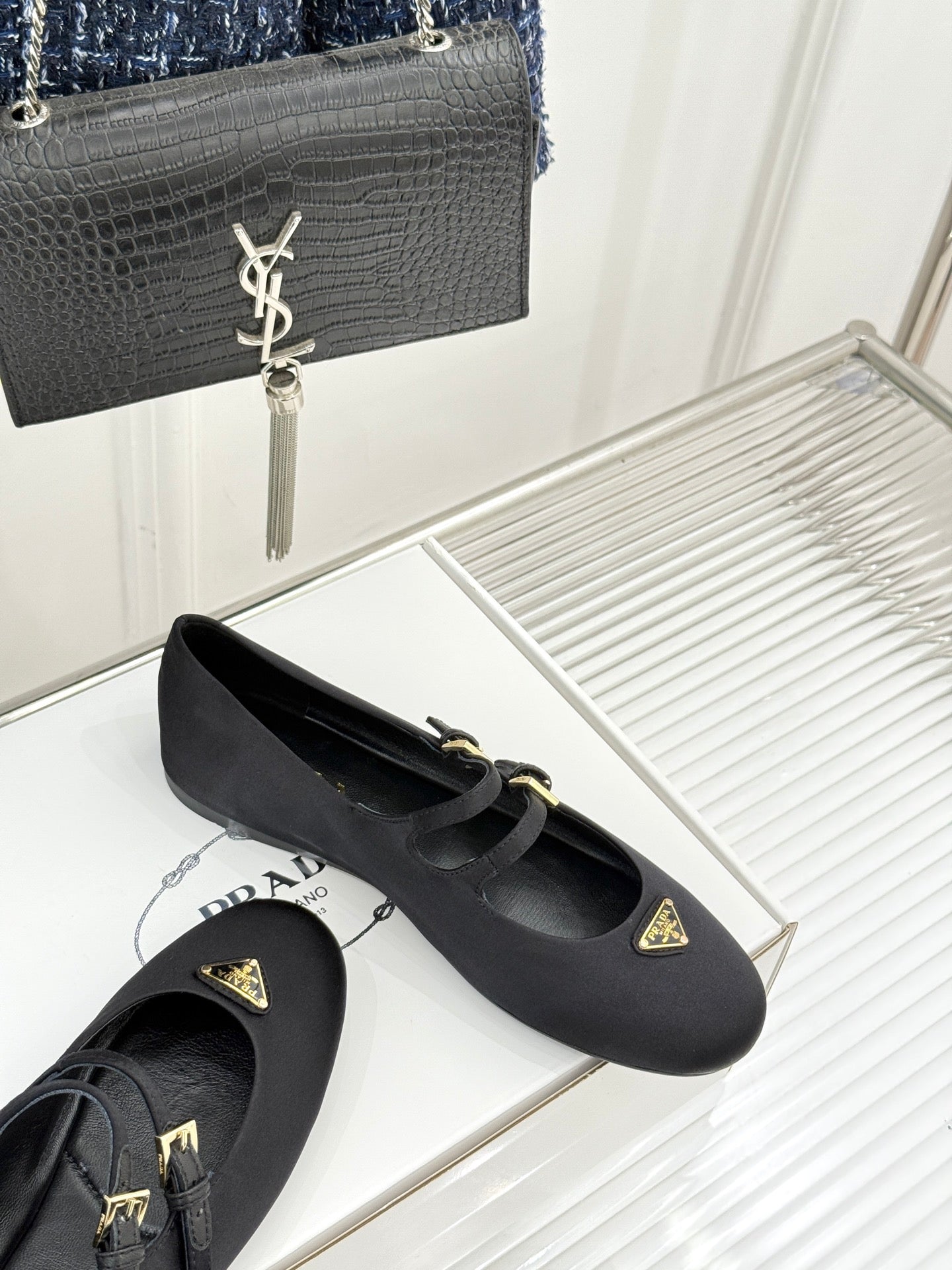 PRADA 25S DOUBLE STRAP BALLERINAS IN BLACK SATIN