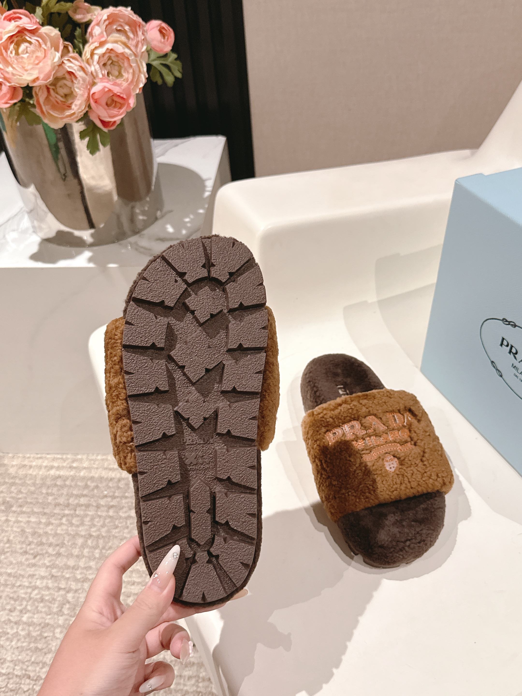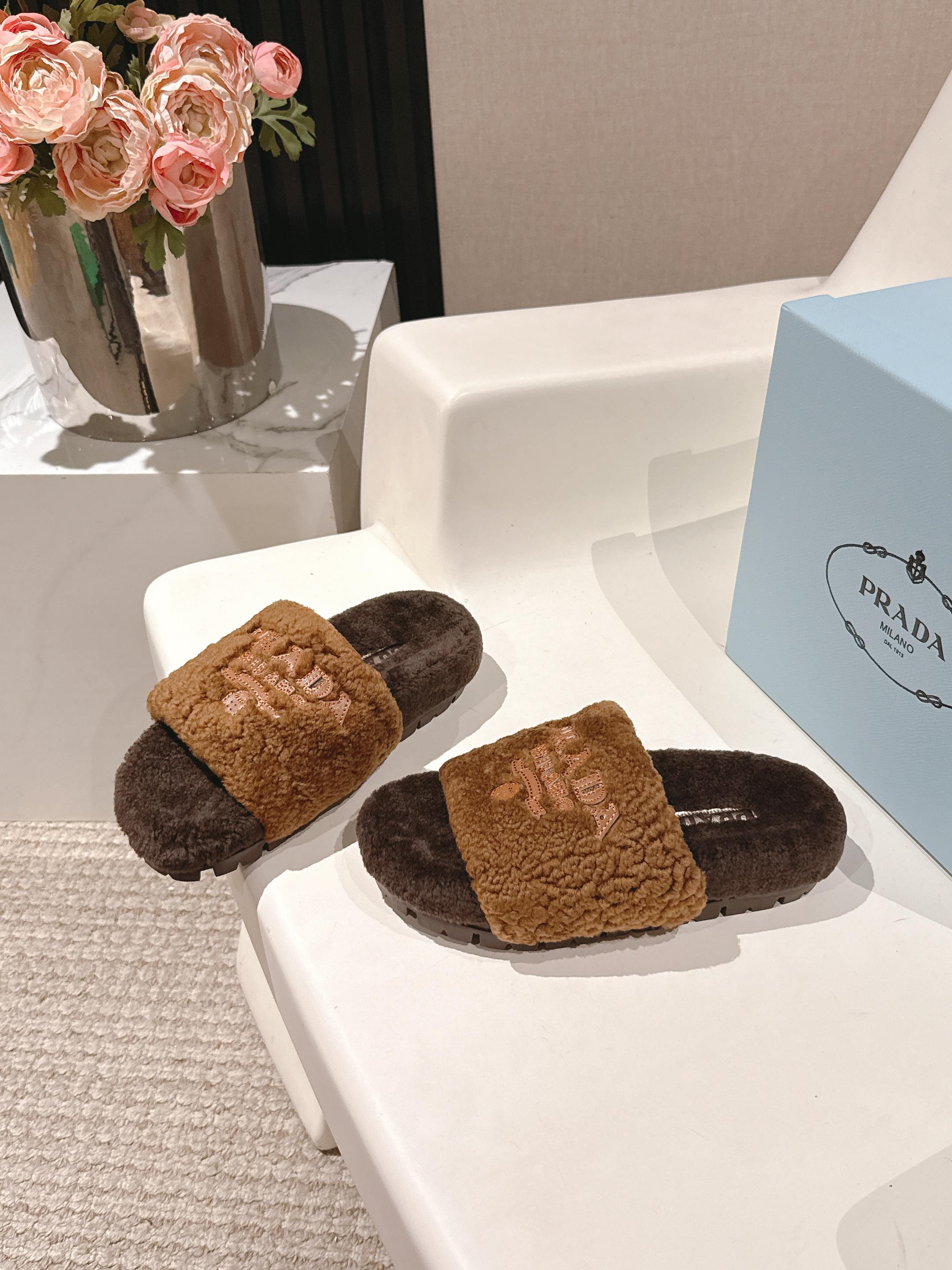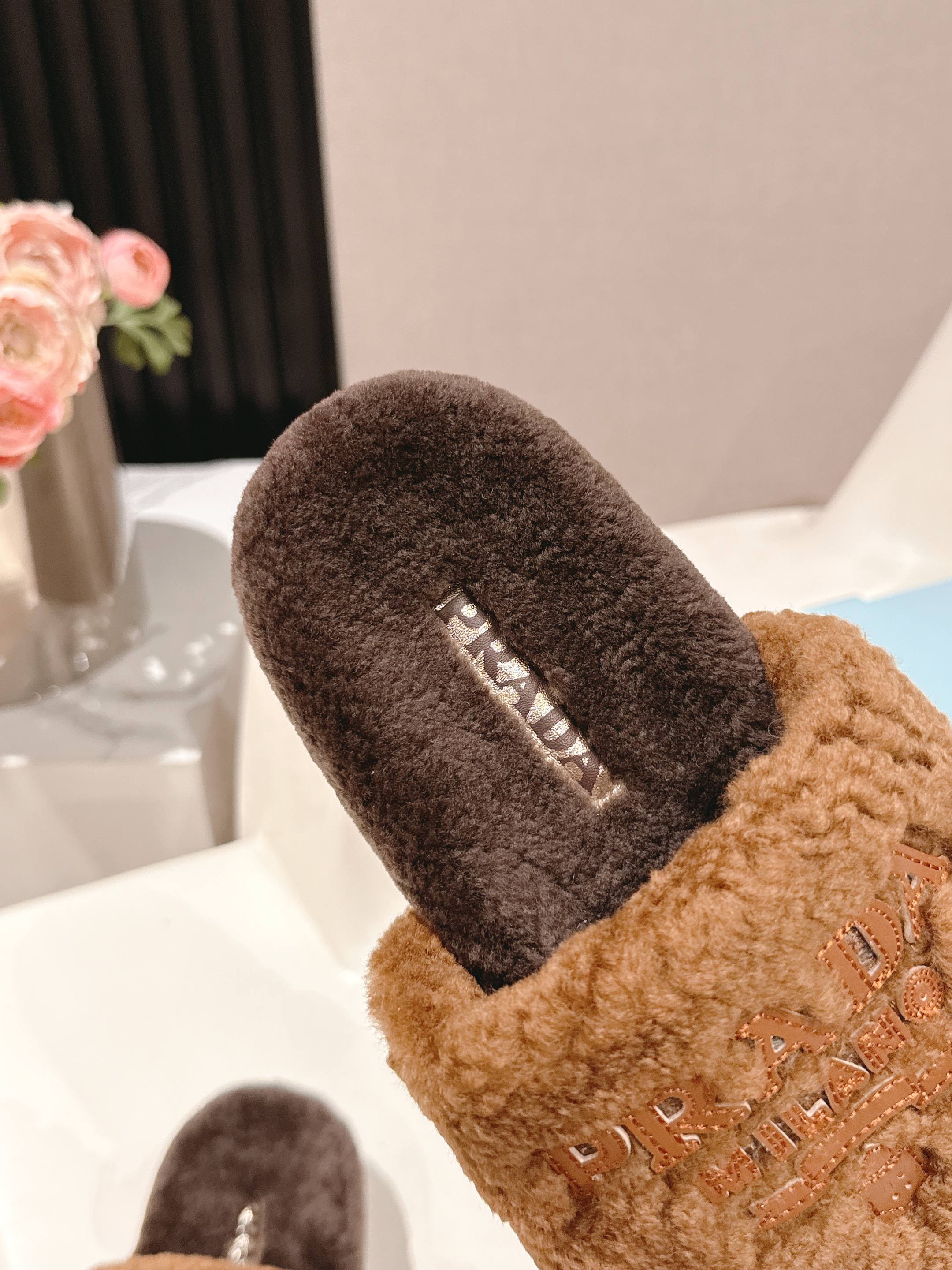 PRADA 25S FLAT MULES IN DARK BROWN RABBIT FUR