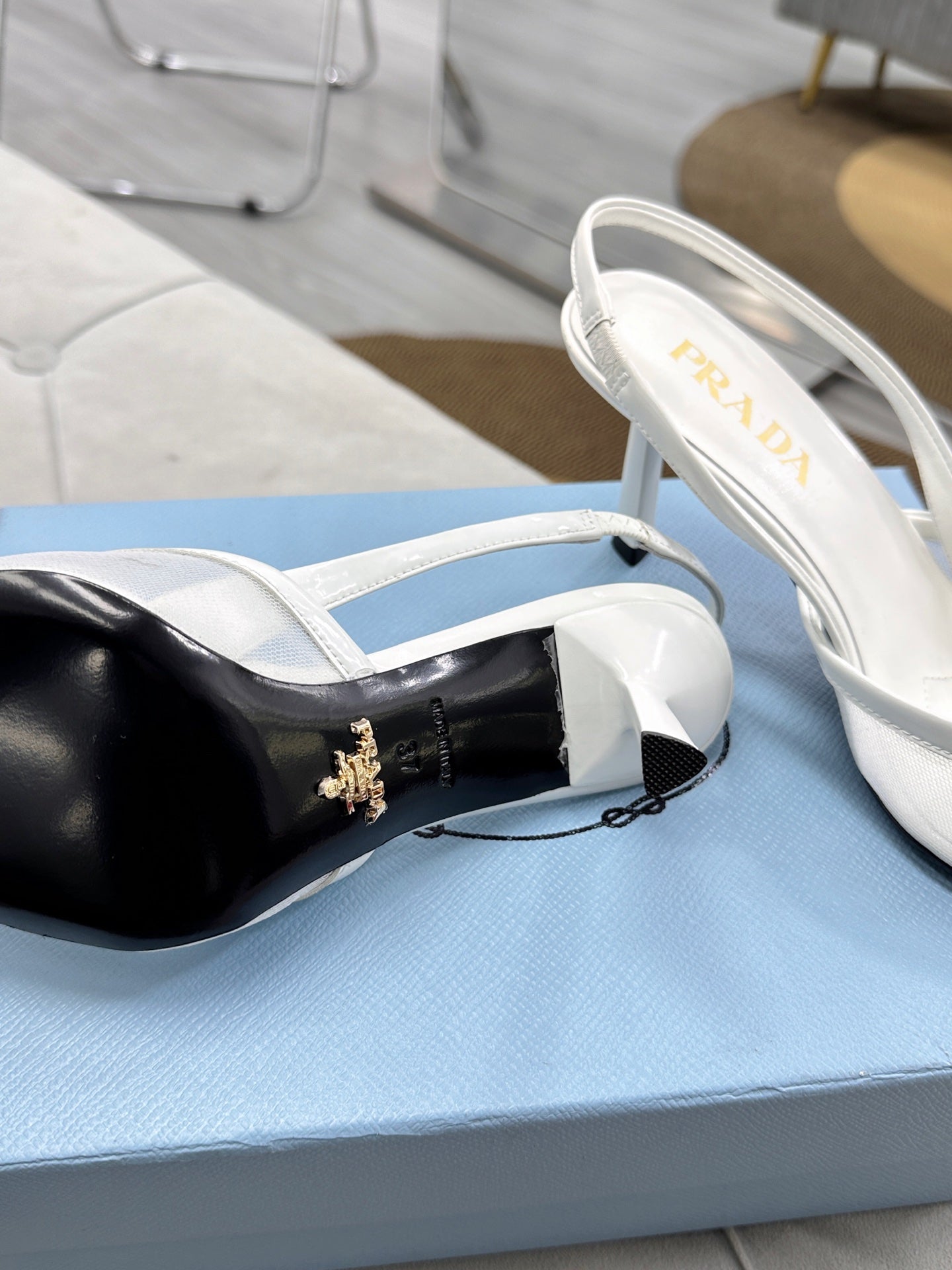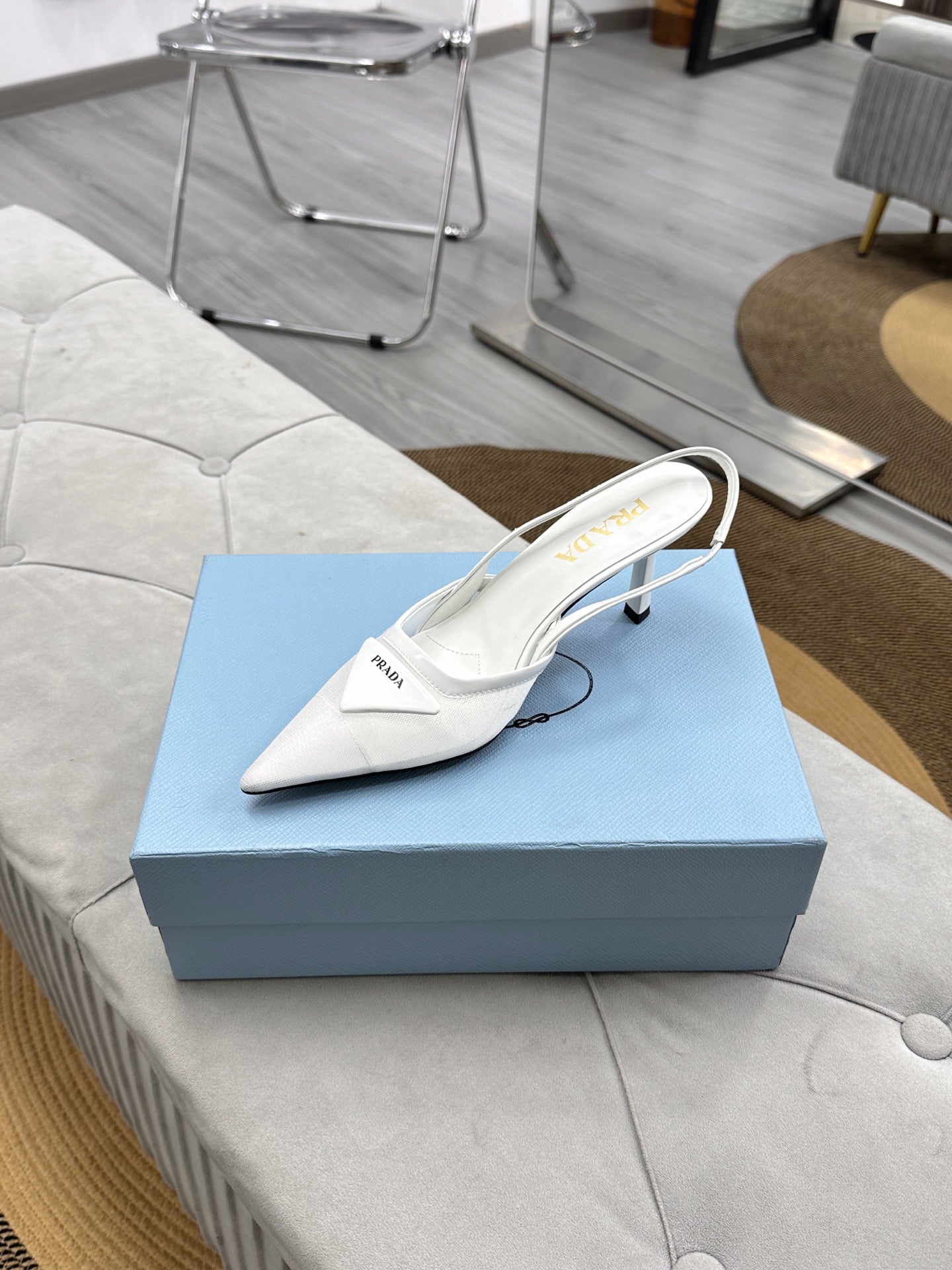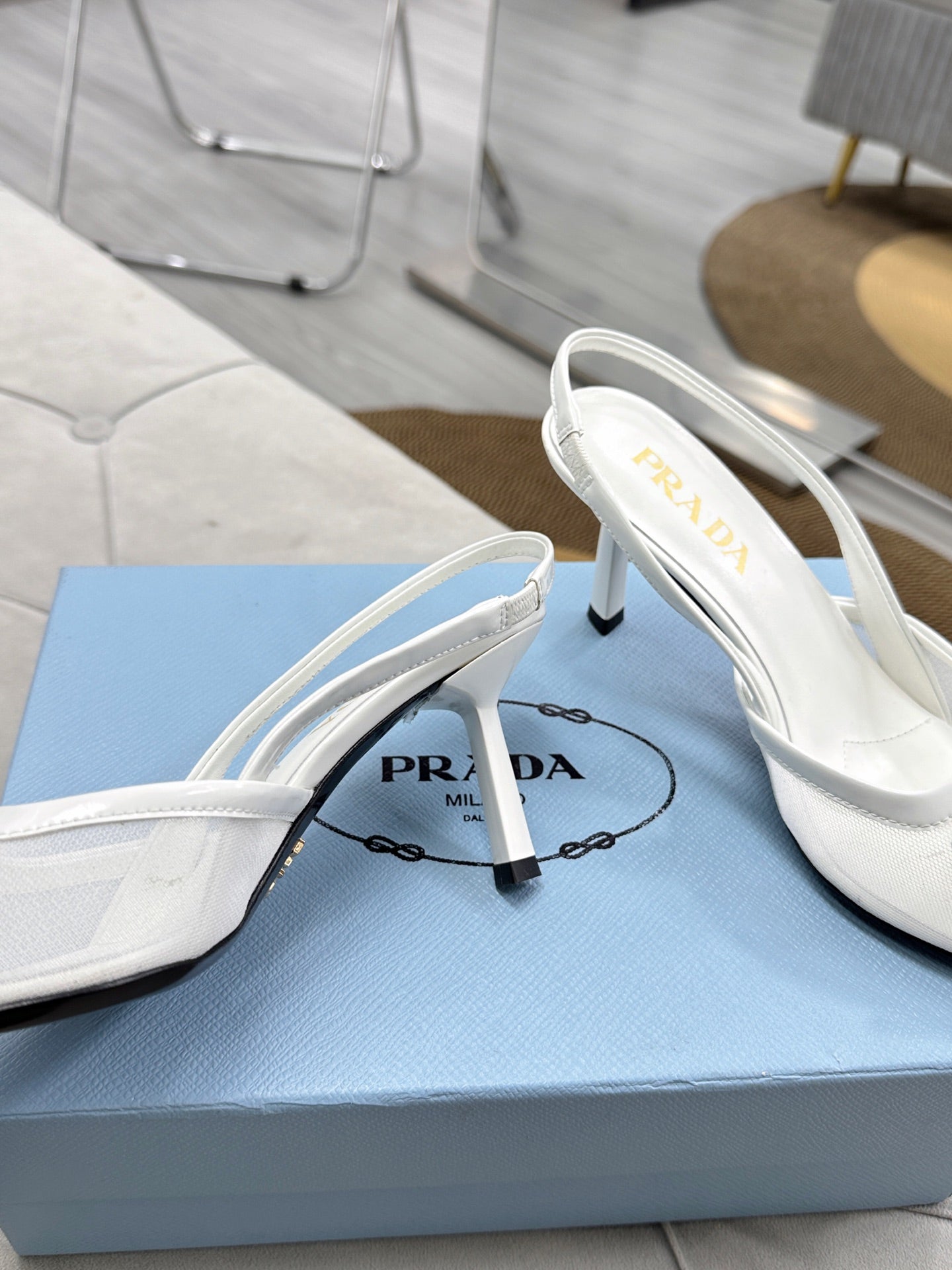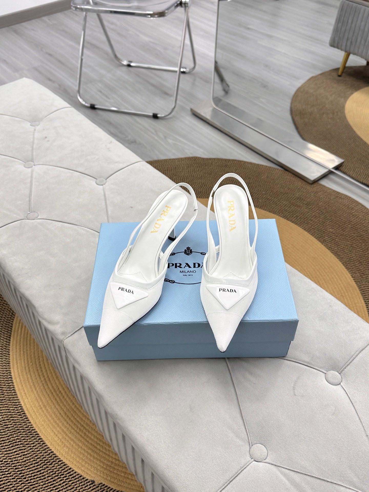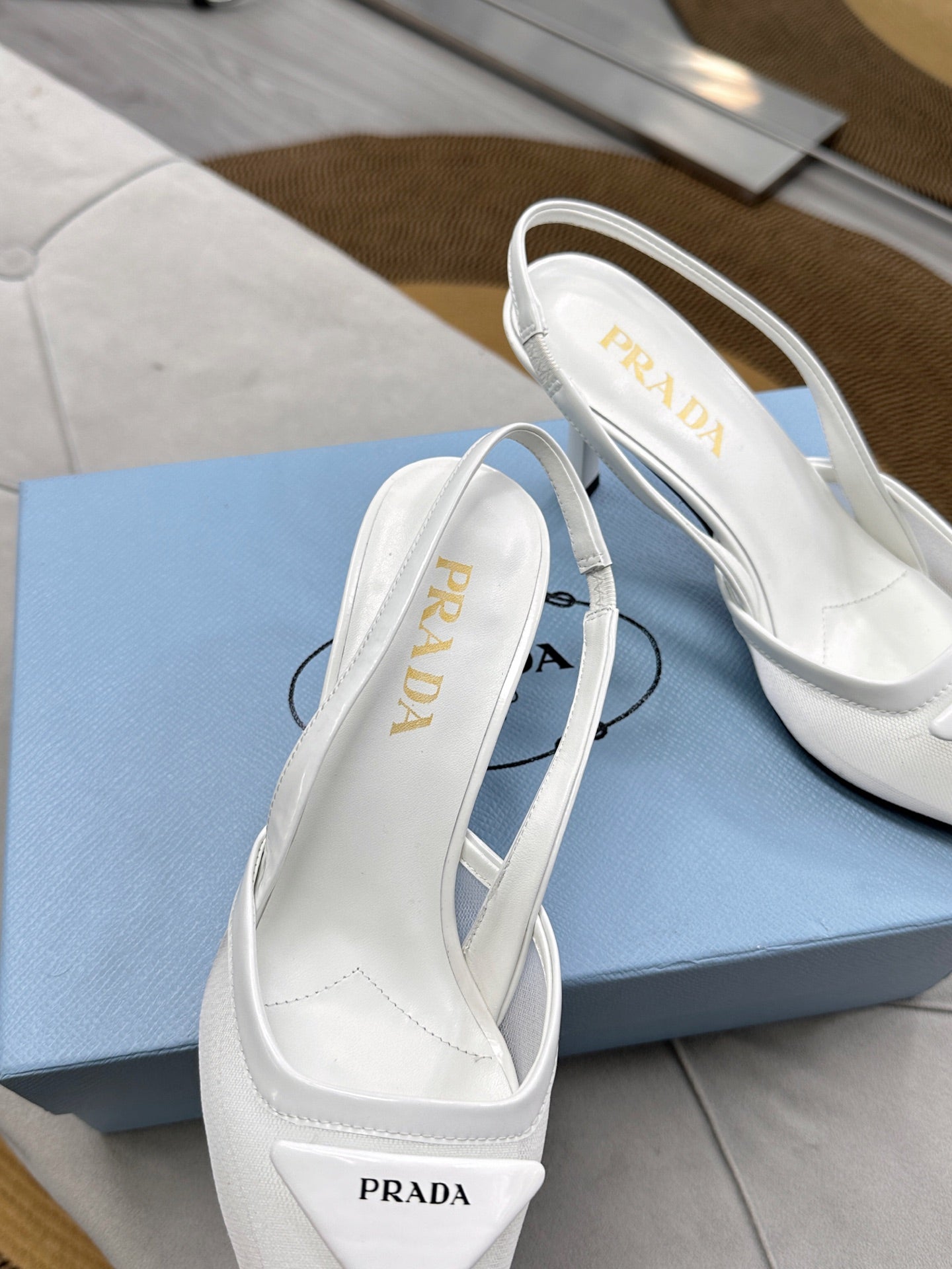 PRADA 25S TRIANGLE LOGO SLINGBACK PUMPS IN WHITE MESH FABRIC