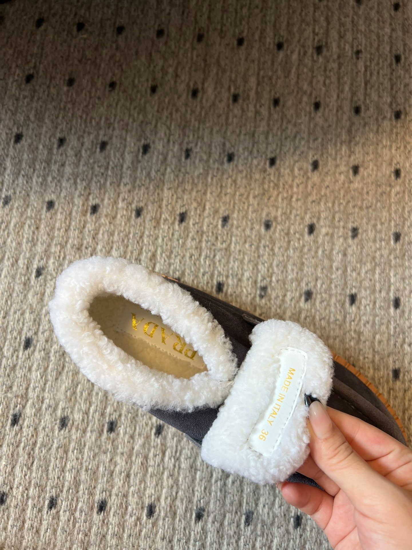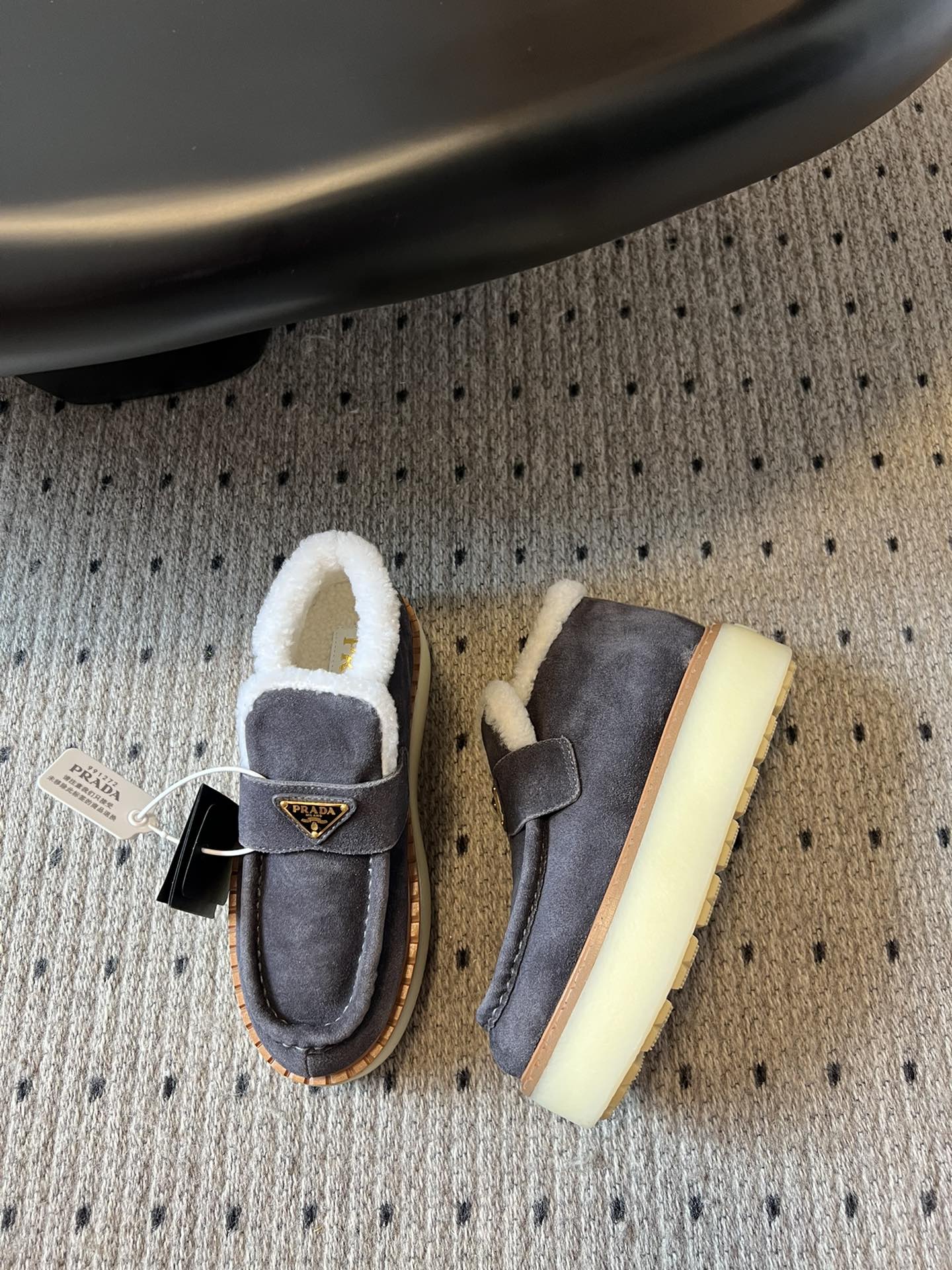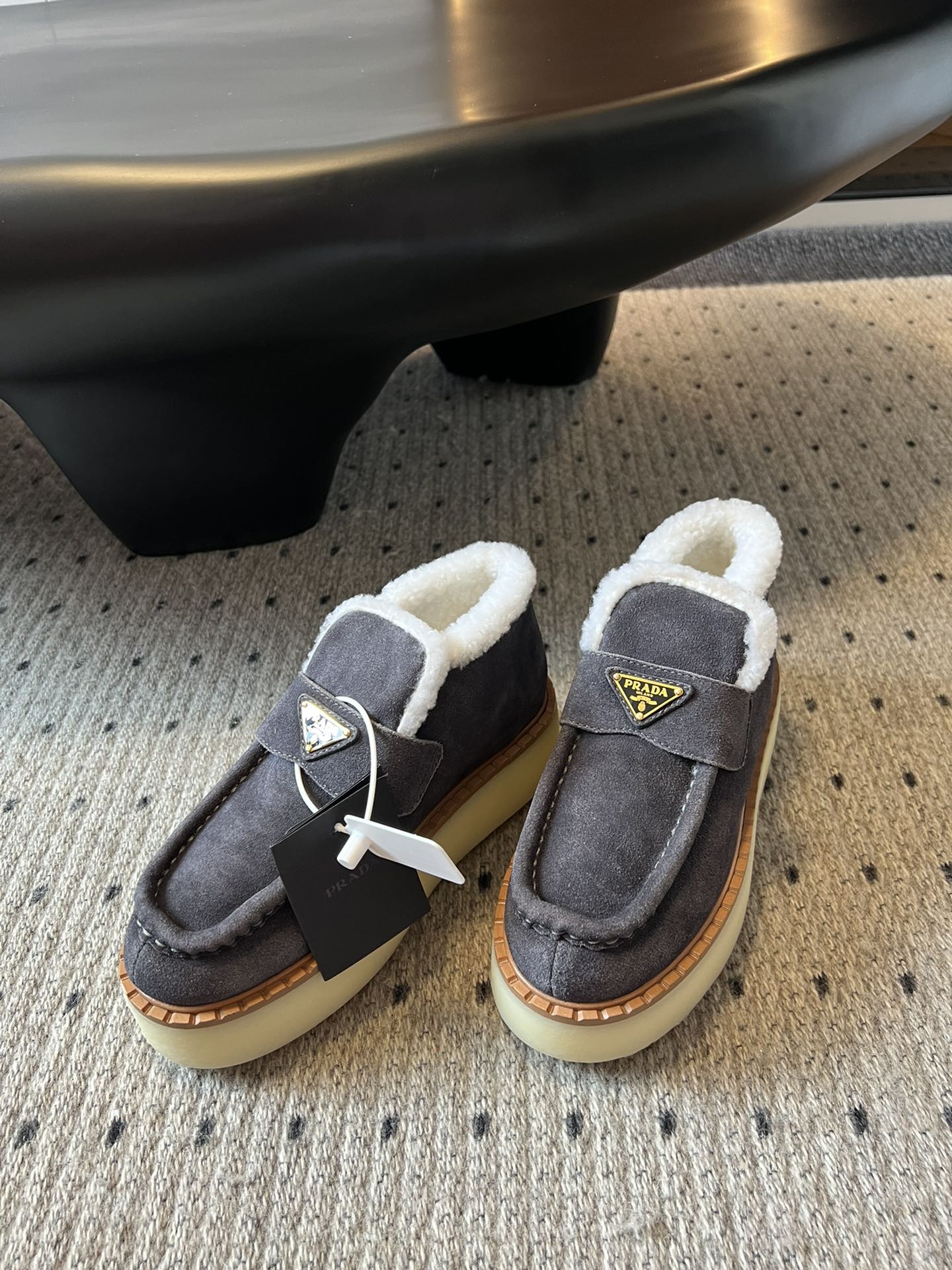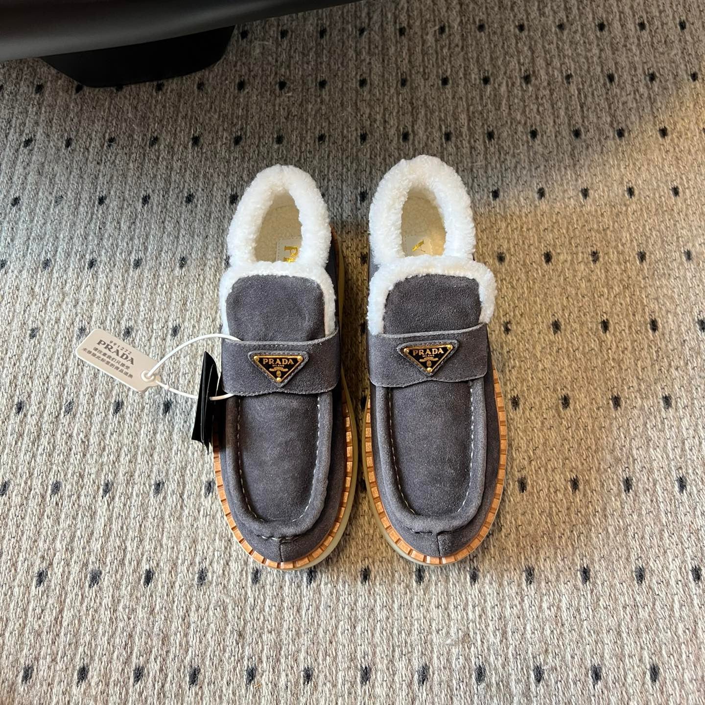PRADA WHITE SHEARLING LOAFERS IN GREY SUEDE