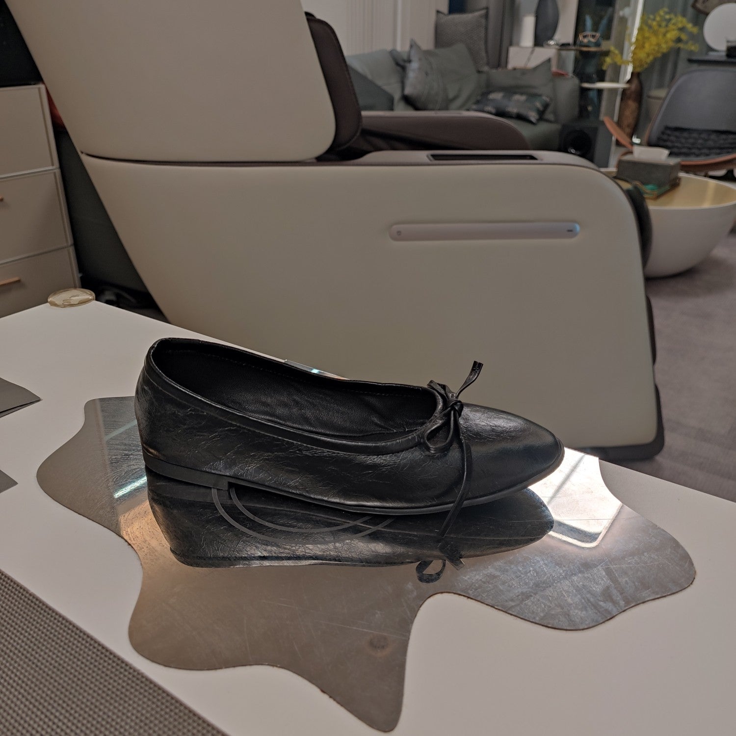 RHINESTONE BALLET FLATS WITH BOW IN BLACK WAX-OIL SHEEPSKIN