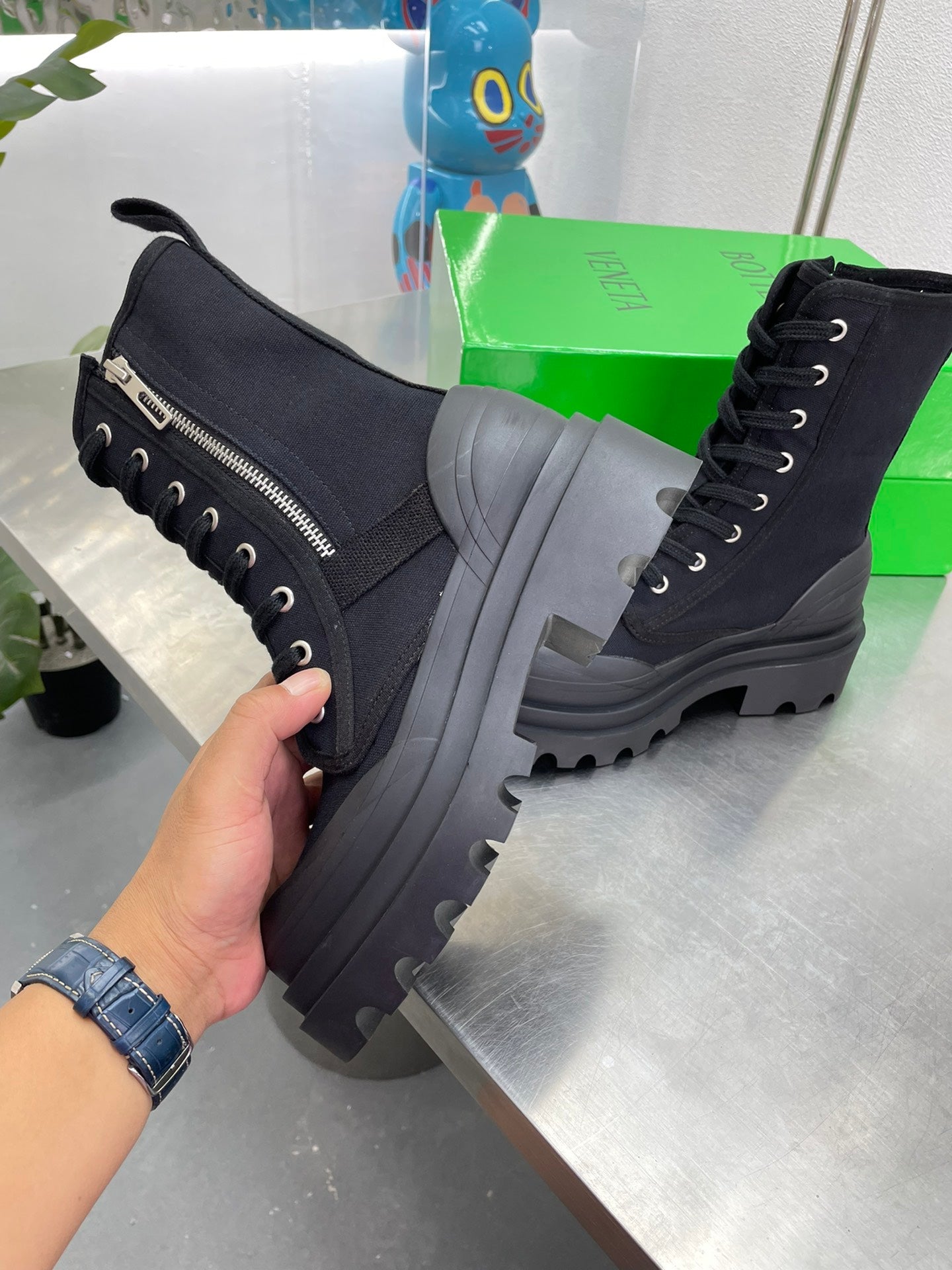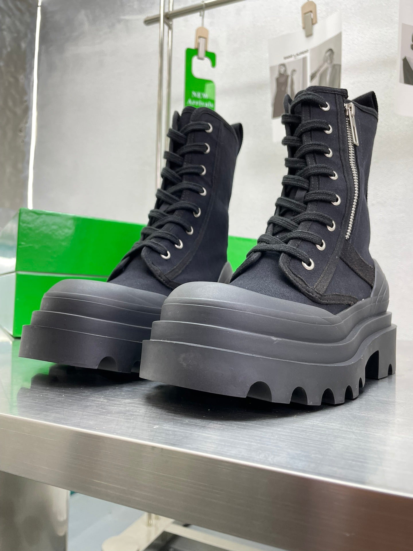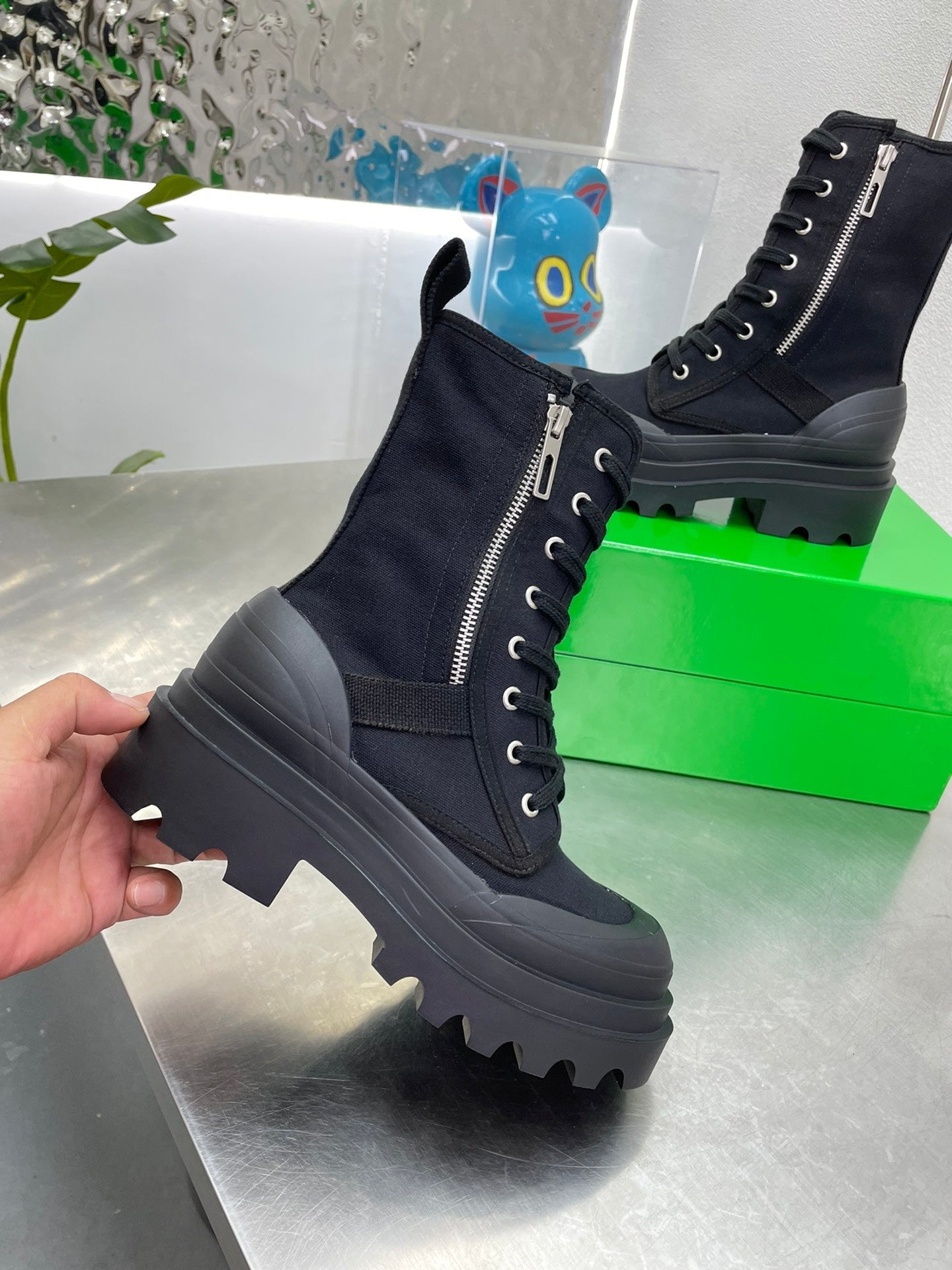 RIBBON BOMBER LACE-UP BOOTS IN BLACK CANVAS