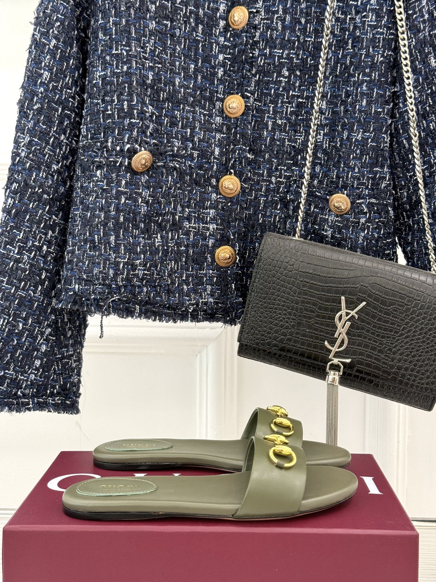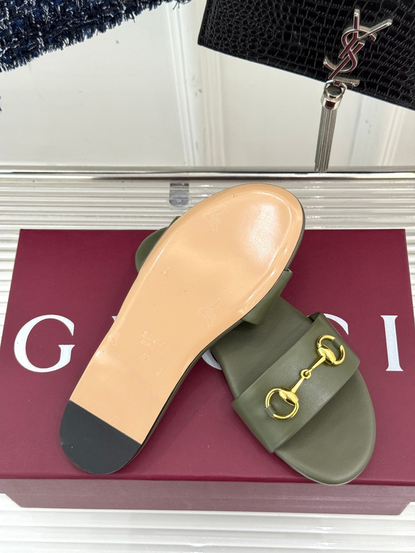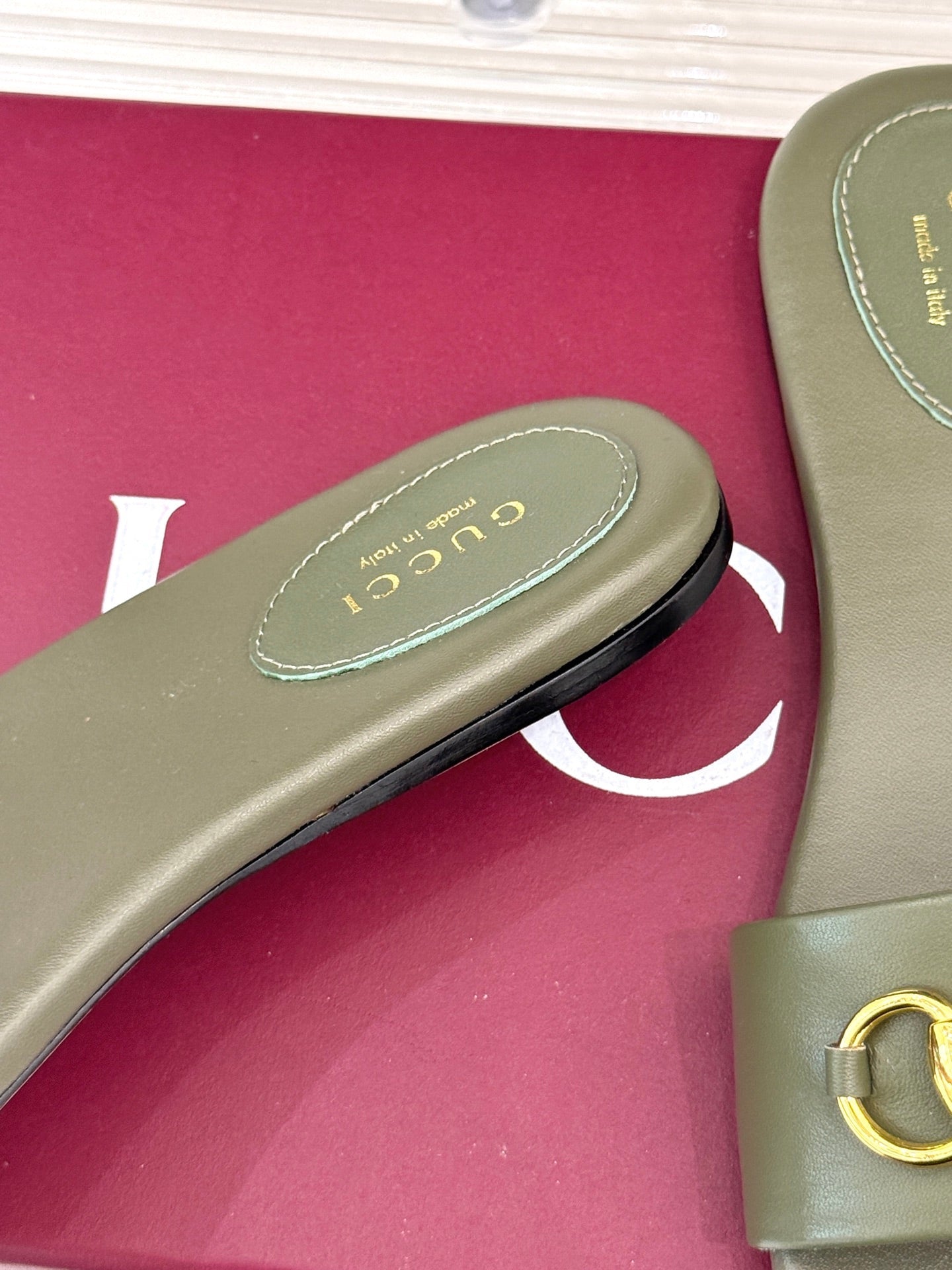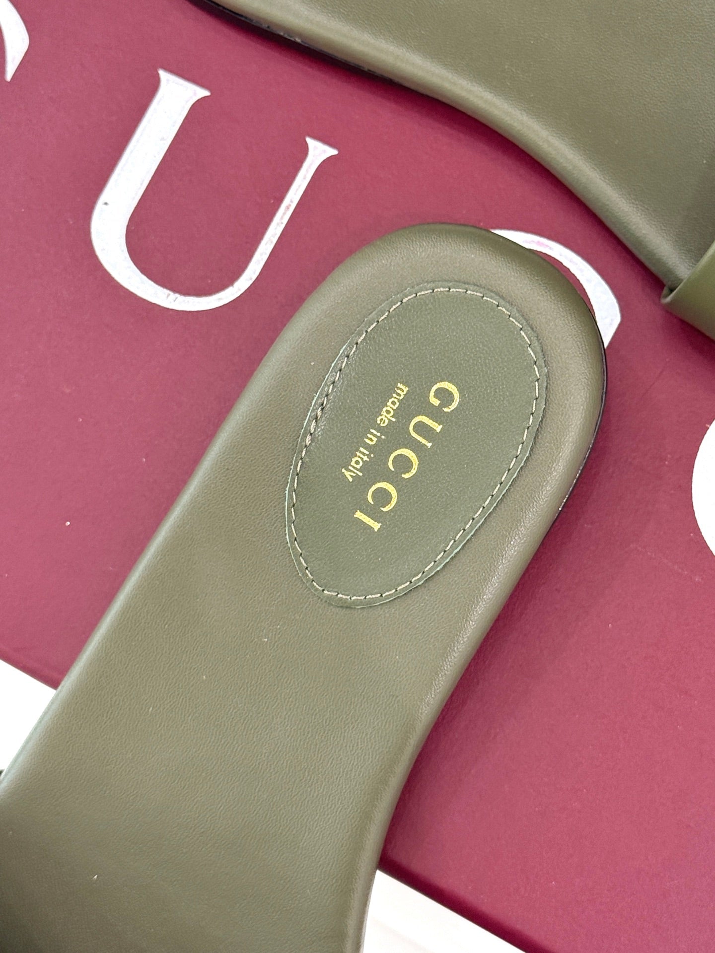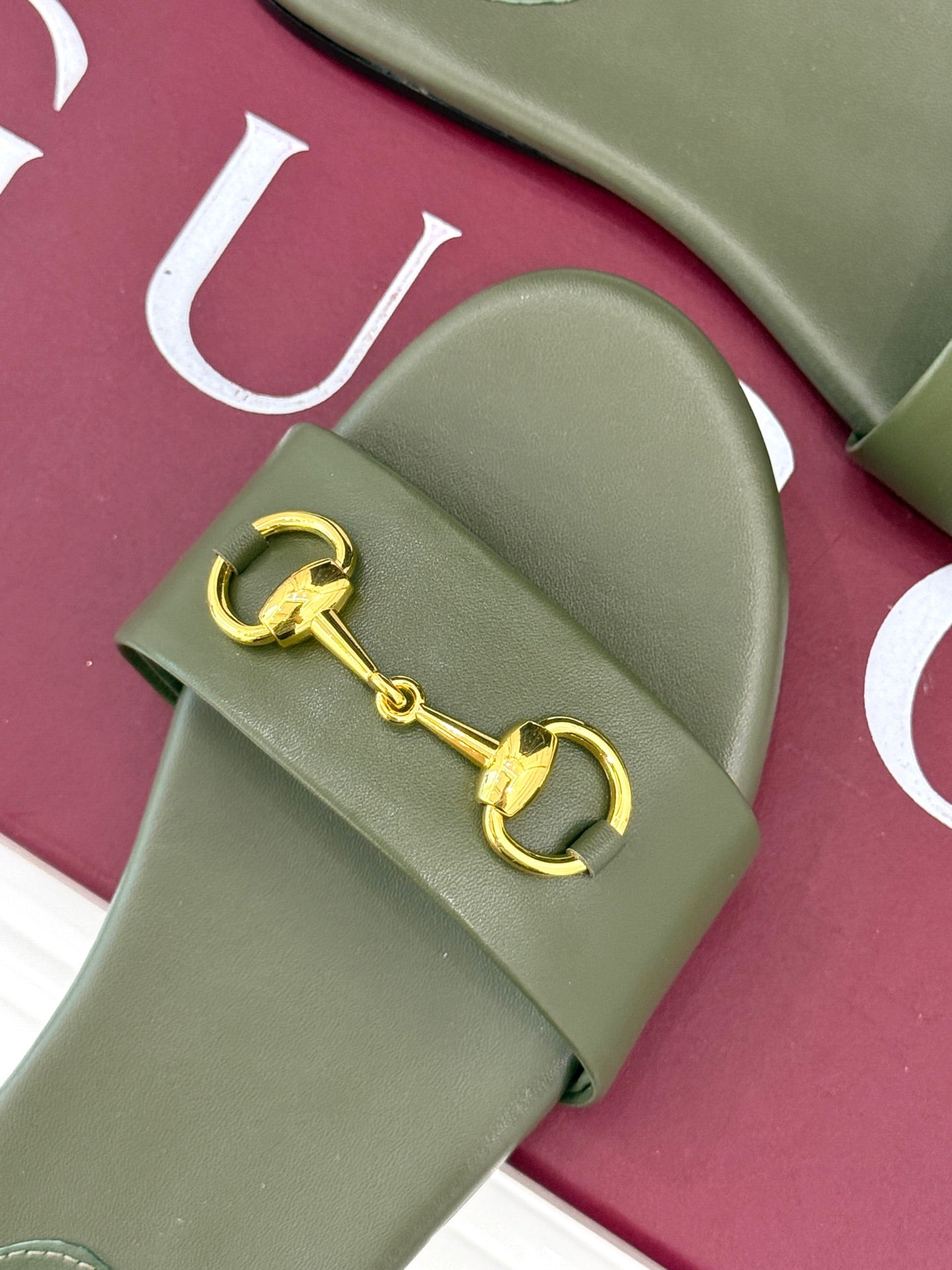 SLIDE SANDALS IN MOSS GREEN CALFSKIN WITH GOLD HARDWARE