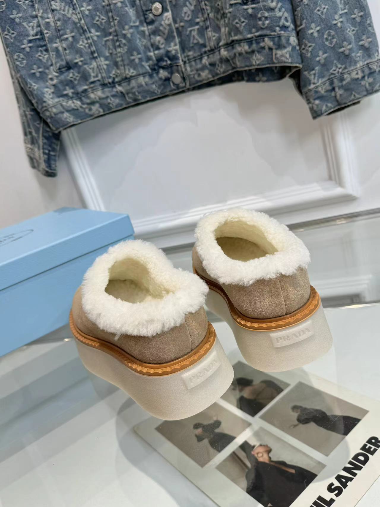 TRIANGLE LOGO MULES IN BEIGE SUEDE AND SHEARLING LINING