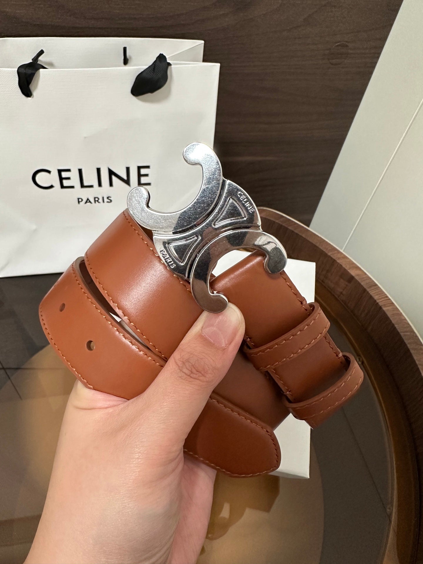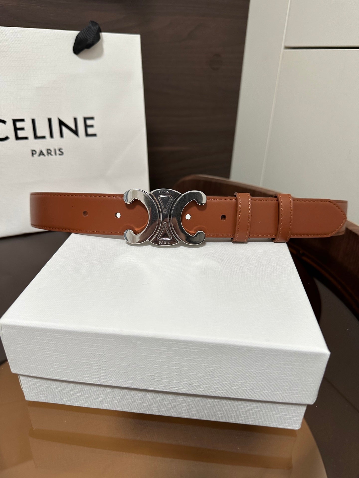 TRIOMPHE BELT 30MM IN BROWN CALFSKIN WITH SILVER BUCKLE