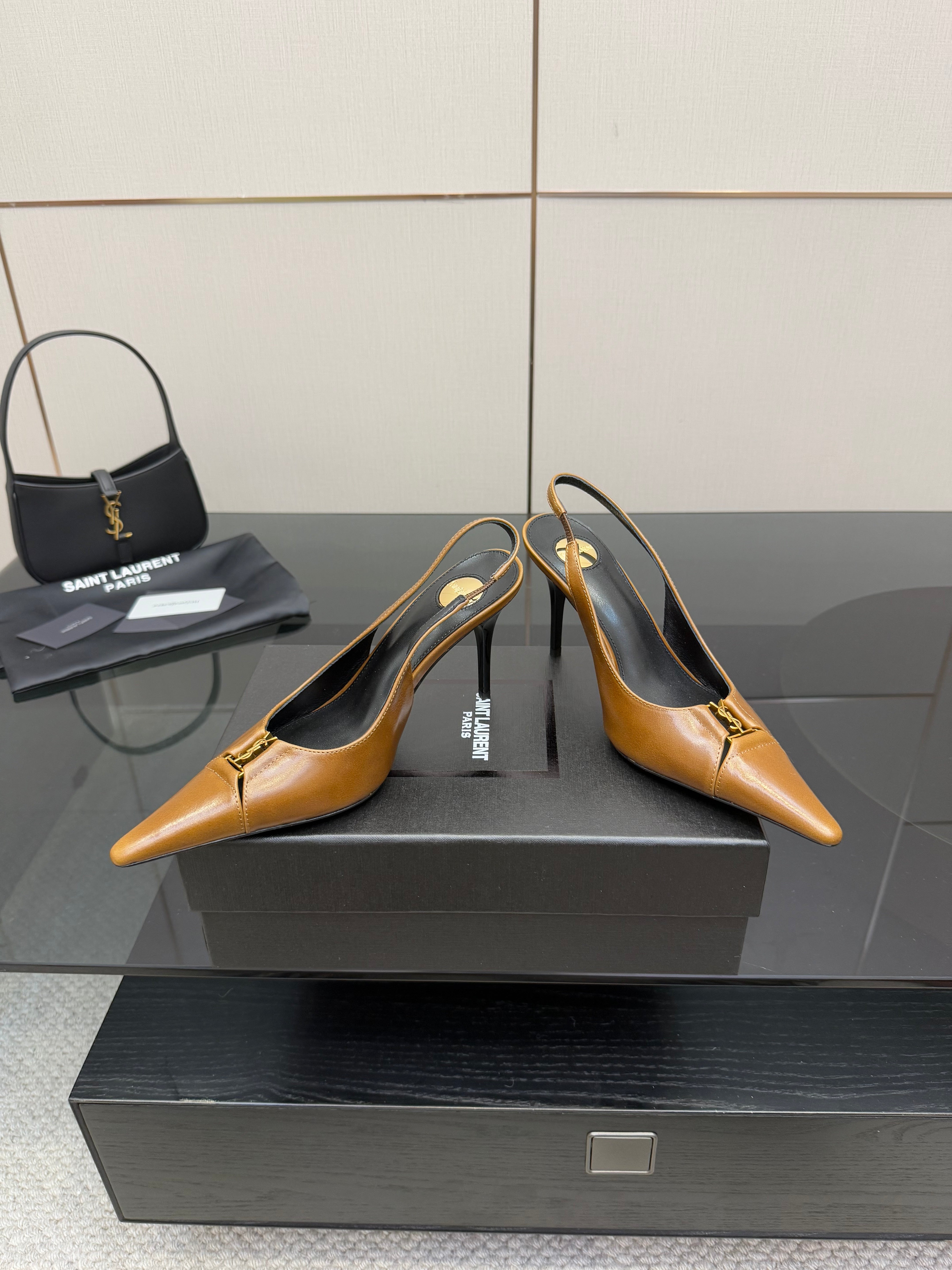 YSL 25S SLINGBACK HIGH HEELS 90 MM IN COPPER BROWN LAMBSKIN WITH GOLD HARDWARE STYLE 11