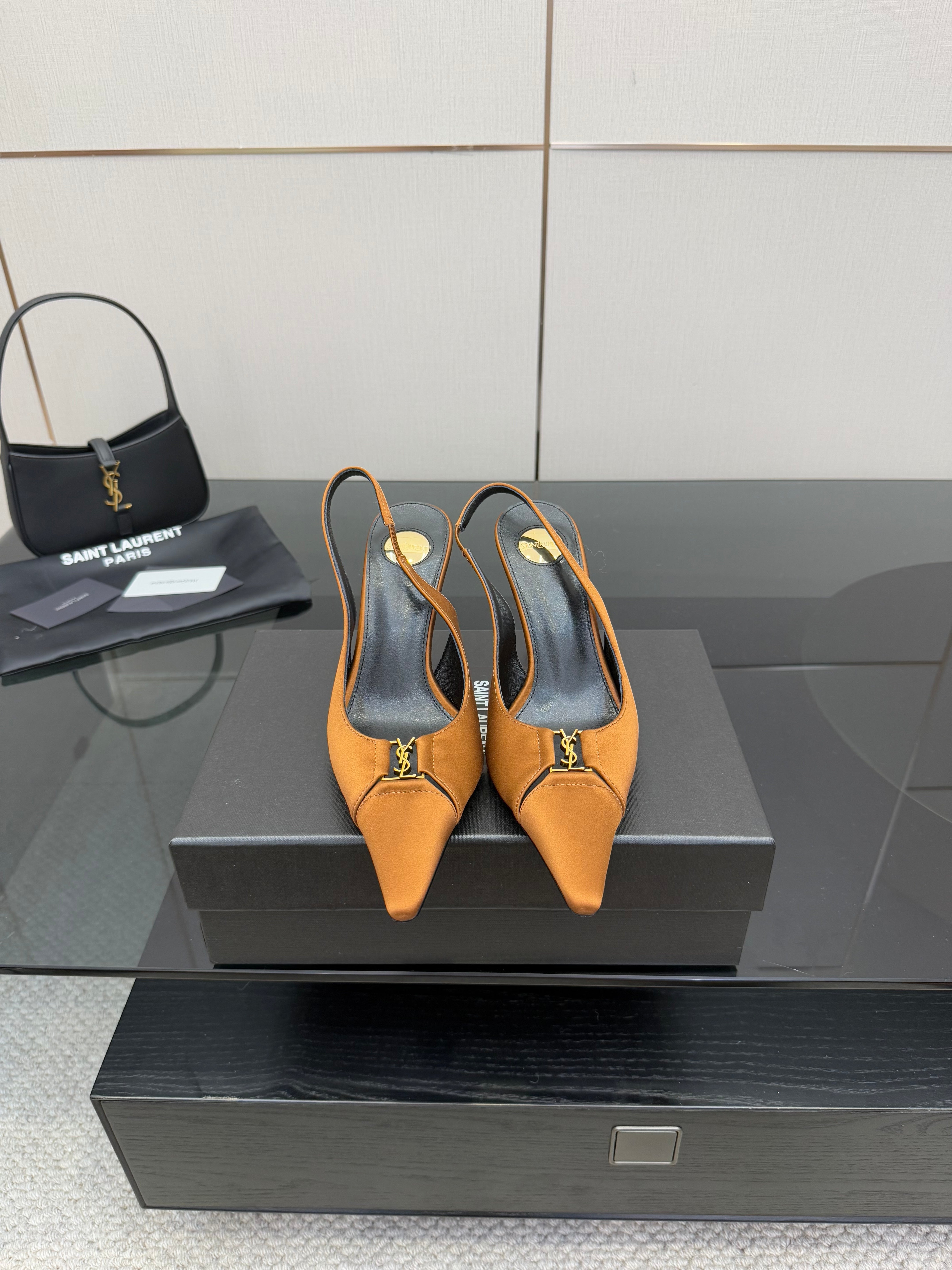 YSL 25S SLINGBACK HIGH HEELS 90 MM IN DARK ORANGE SATIN WITH GOLD HARDWARE STYLE 16