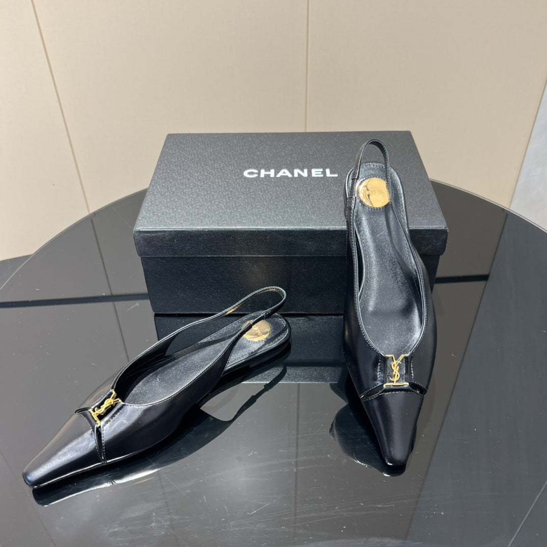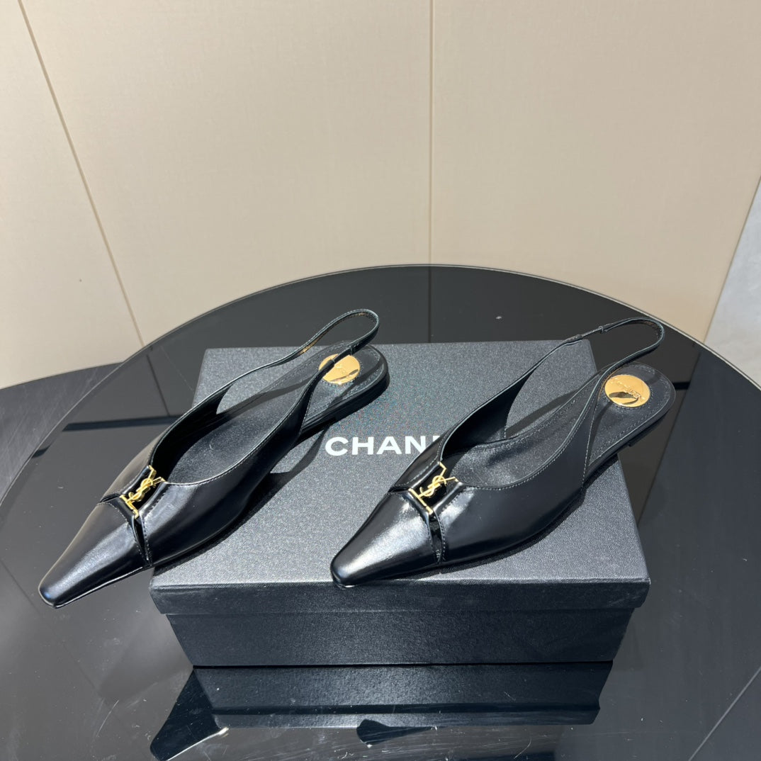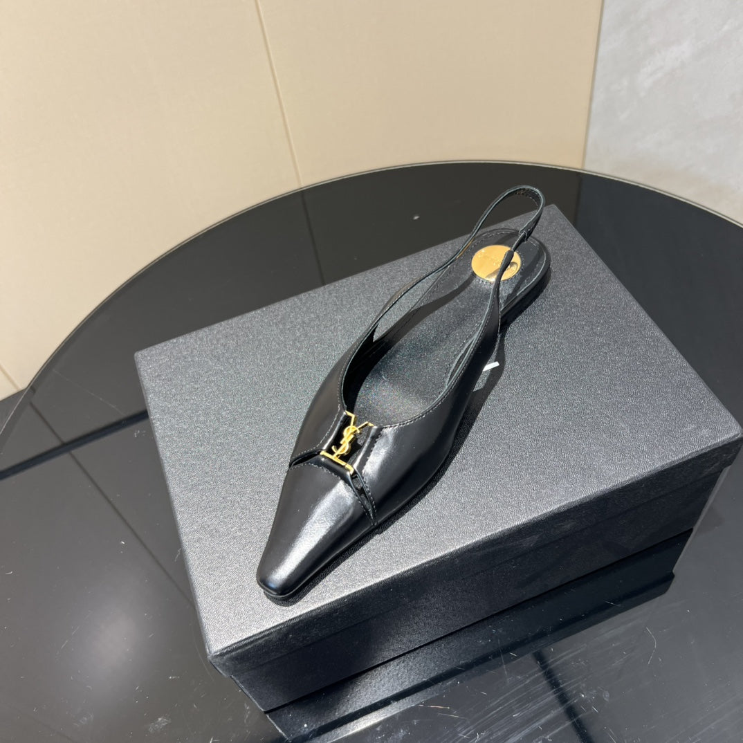 YSL SLINGBACK FLATS 25S IN BLACK LAMBSKIN WITH GOLD HARDWARE