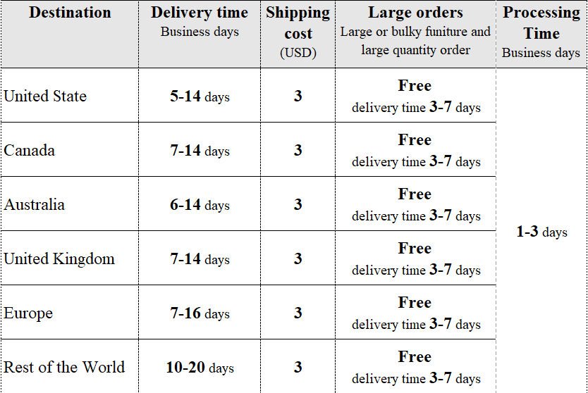 Usually, orders are processed within 1-3 days, but in some cases, it may take longer. If processing time exceeds 5 days, we will contact you via email. Currently, the estimated delivery time to the United States, the United Kingdom, Canada, and Australia is about 5 to 12 business days, the EU region takes about 7-18 business days, and other regions may take around 10-21 business days. Please note that these are only estimated times and may vary, being either faster or slower in different delivery locations.